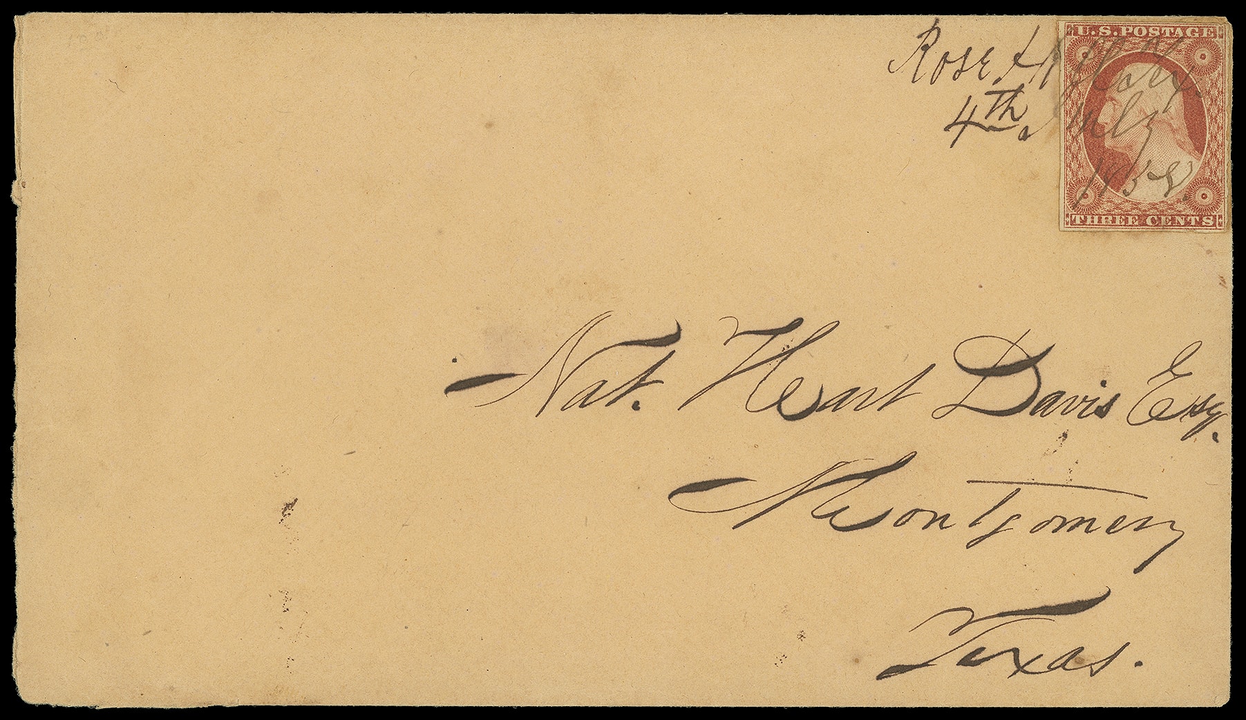 July 1858". Manuscript postmark ties 3¢ dull red (11A) four margins, corner crease, on buff cover to Montgomery, Texas, Very Fine. Estimate; $50 - 75.
