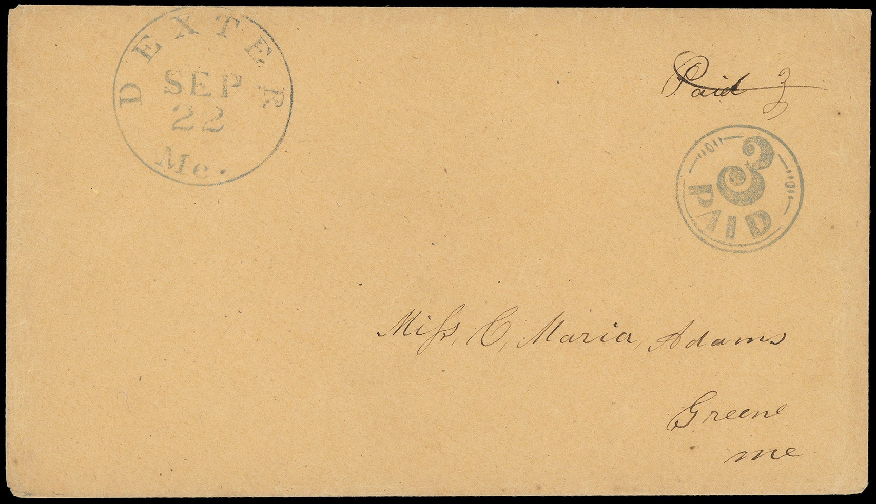22. Near blue cds with matching fancy "Paid 3" rating handstamp on buff cover to Greene Me., Very Fine. Estimate; $100 - 150. (Image1)