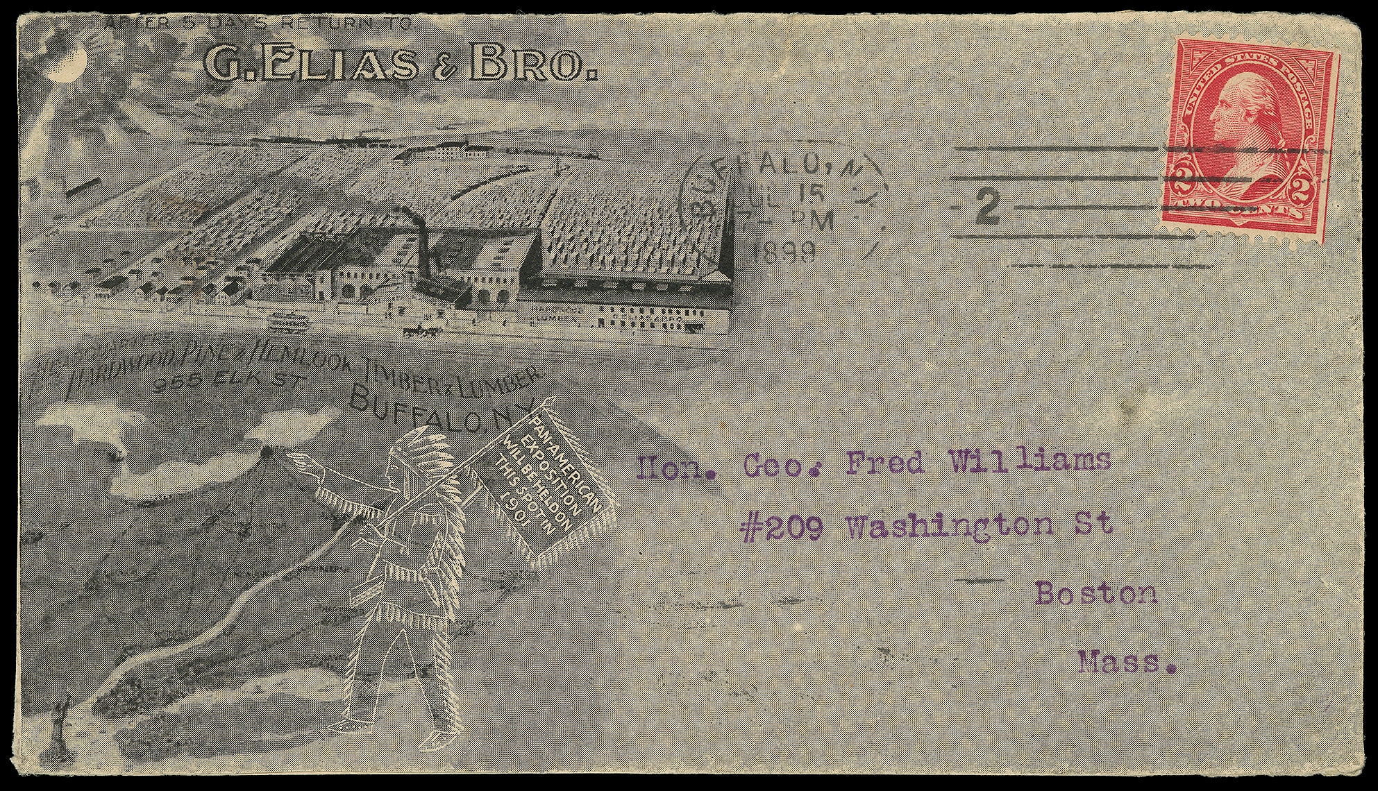 Exposition) G. Elias & Bro., Hardwood, Pine & Hemlock Timber & Lumber, Buffalo N.Y. Overall shaded ad cover showing lumber mill and Expo Indian below on cover bearing 2¢ carmine (279B) guideline s.e., tied by "buffalo, N.Y. Jul 15, 1899"