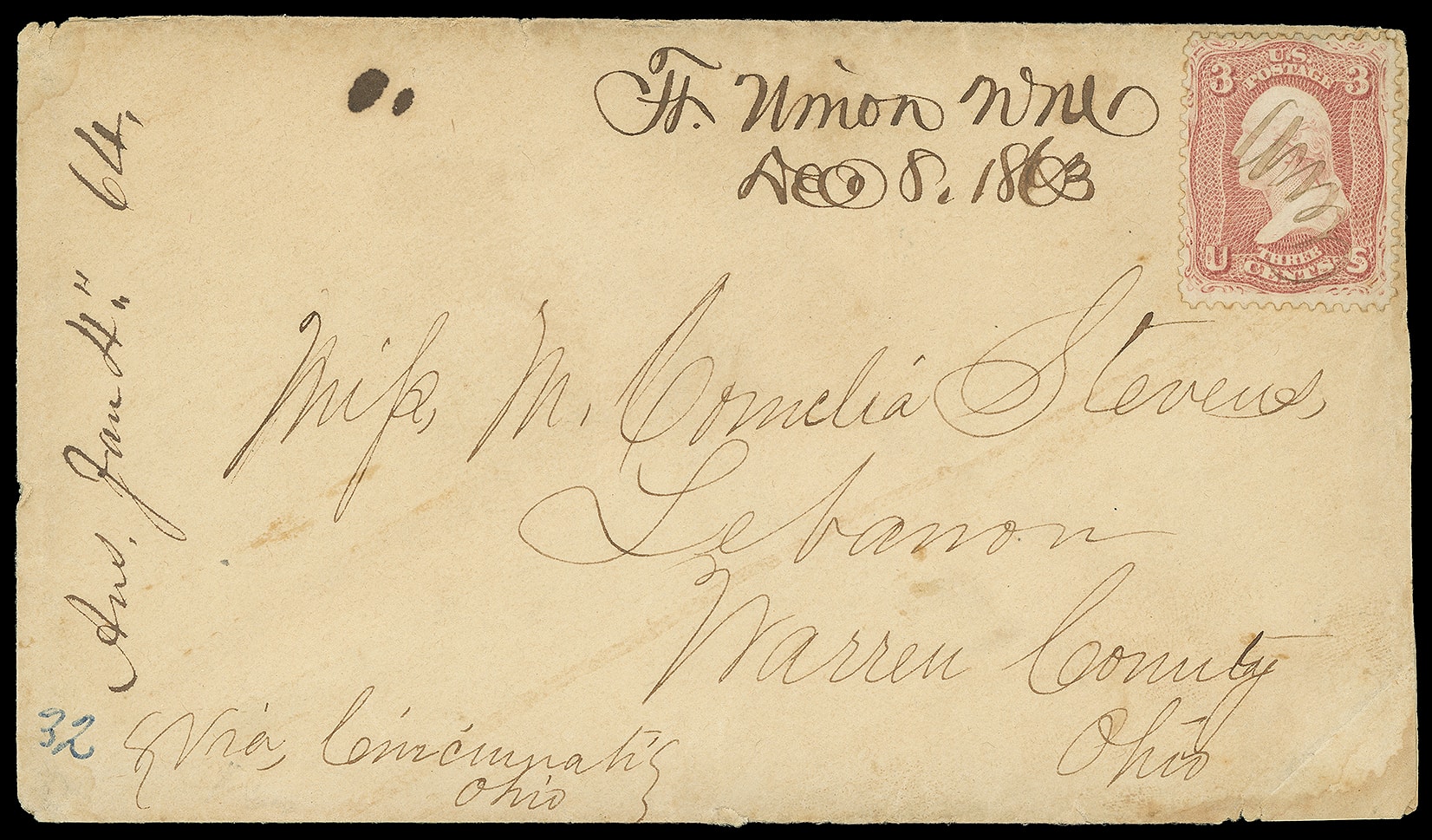 Dec 8, 1863". Manuscript postmark with matching ms. squiggle cancels 3¢ rose (65) on amber cover to Lebanon, Ohio, endorsed "Via Cincinnati, Ohio" at bottom left; reduced slightly at right, F.-V.F. Estimate; $150 - 200. (Image1)