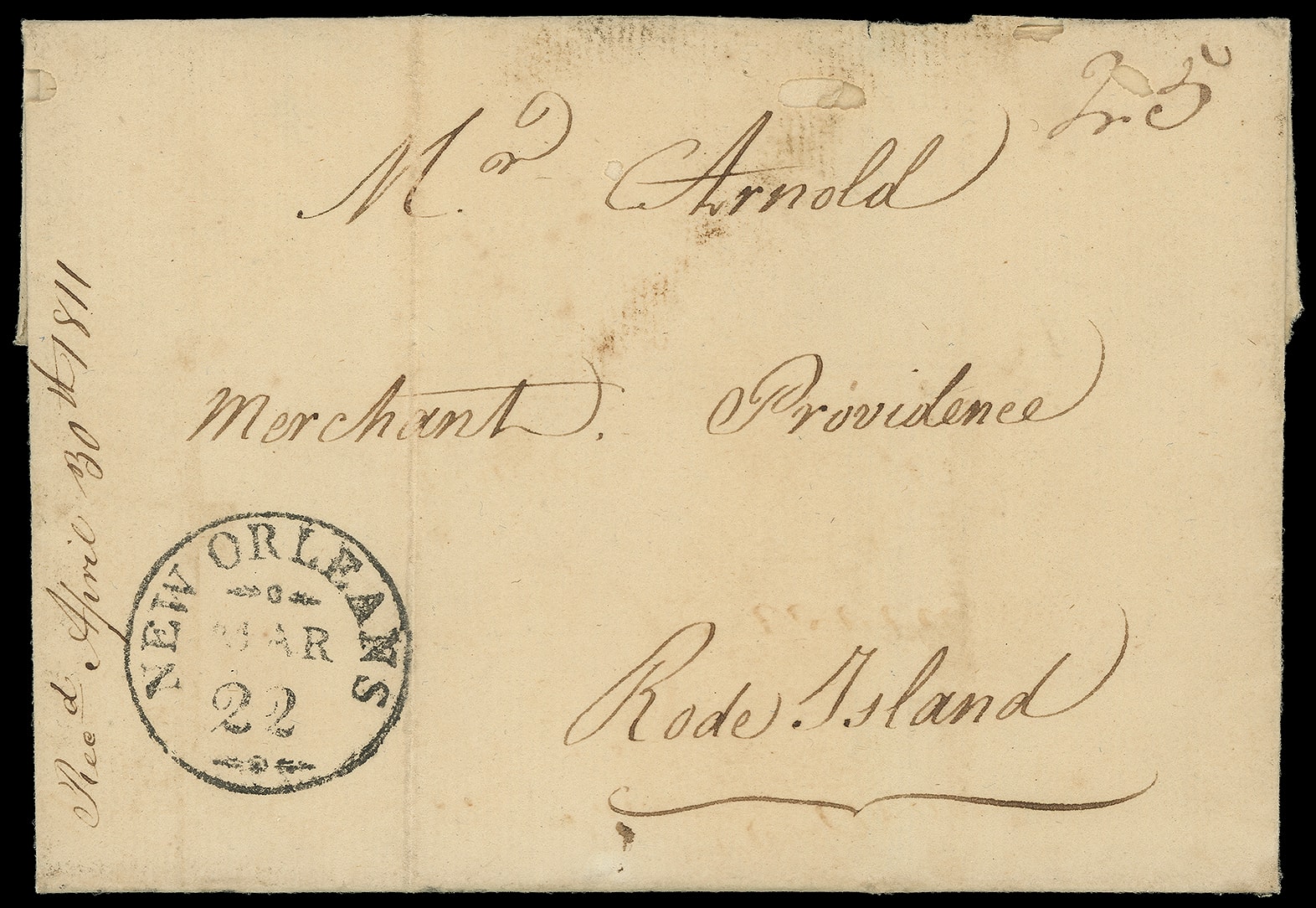 1811 (Mar. 22) New Orleans La. to Providence R.I. Folded cover with "New Orleans, Mar 22" cds and ms. "25" cent rating over 500 miles, docketed received "April 30th 1811" at left; some erosion spots at top, F.-V.F. Estimate; $150 -