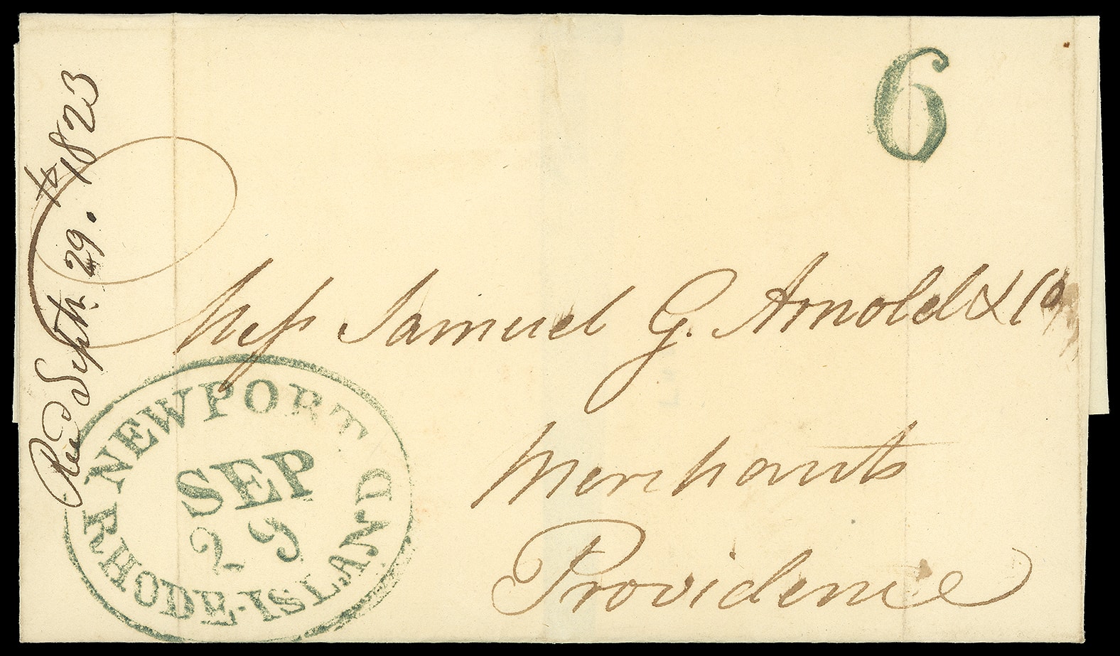 Rhode-Island, Sep 29. Green oval postmark with matching "6" rating handstamp on 1823 folded cover to Providence R.I.; file folds, Very Fine and attactive. Estimate; $50 - 75. (Image1)