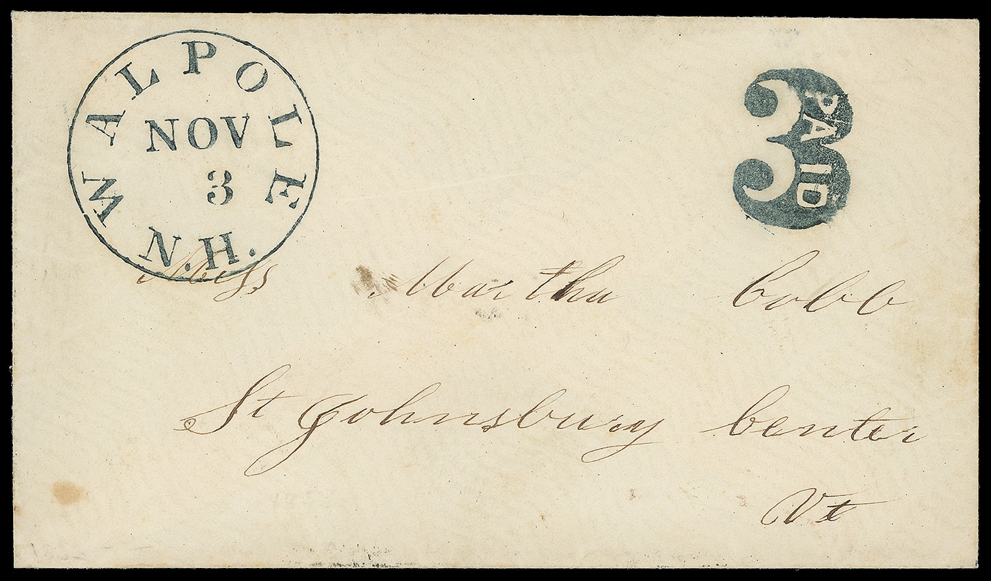 18. Bold cds in dark blue with matching bold "3" with negative "Paid" rating handstamp on cover to St. Johnsbury Center Vt., Extremely Fine and choice. Estimate; $200 - 300. (Image1)