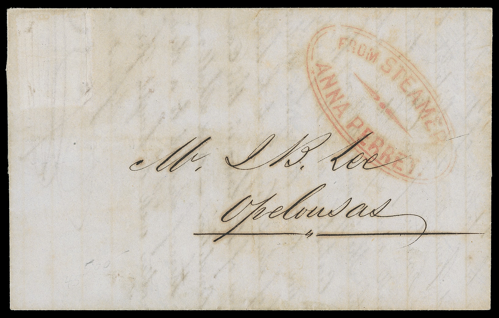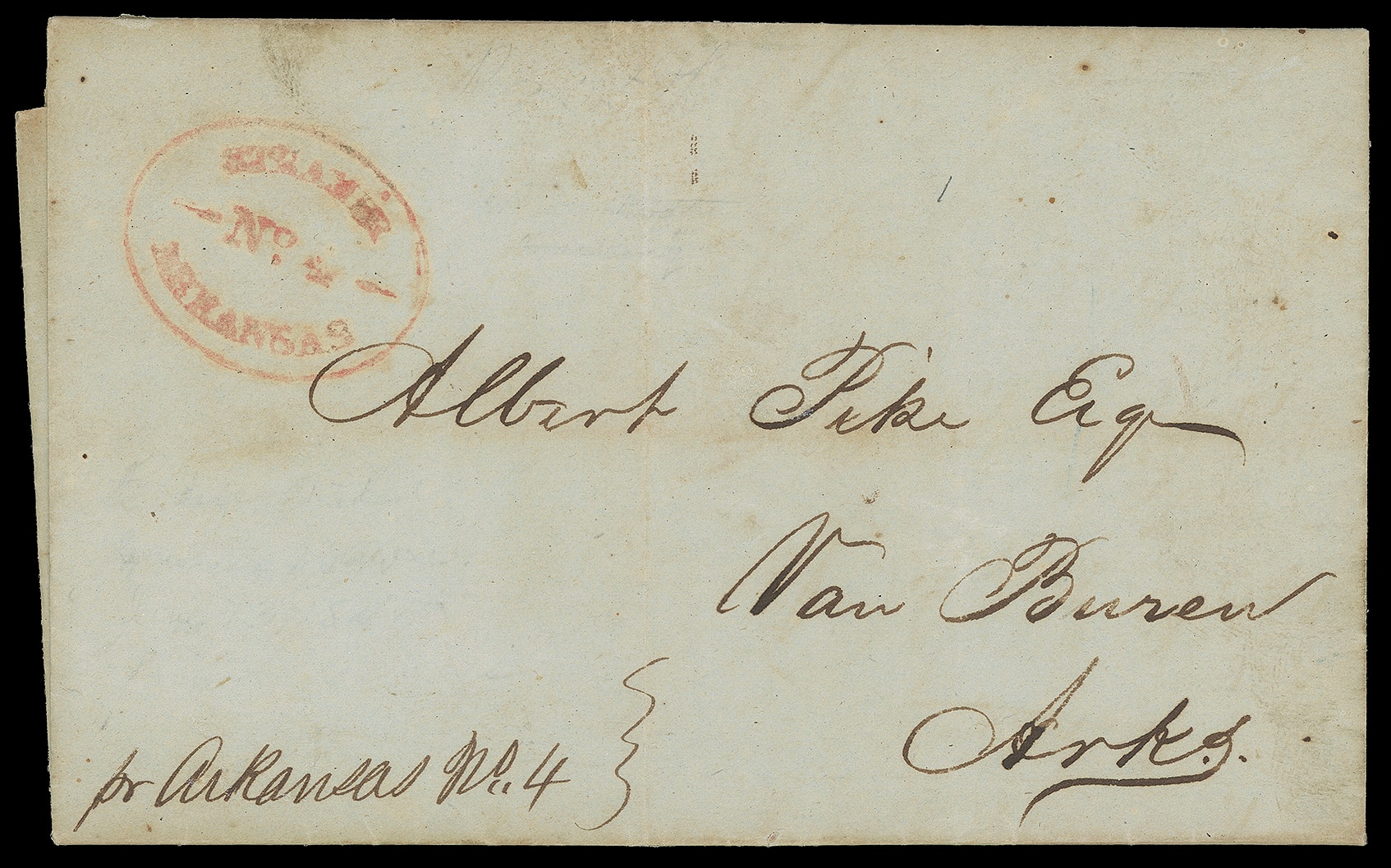 No. 4. Red oval on gray 1845 folded letter from Mobile Ala. to Van Buren, Arkansas.; light soiling, F.-V.F. and scarce early steamboat use. Milgram No. 66; Estimate $200 - 300. (Image1)