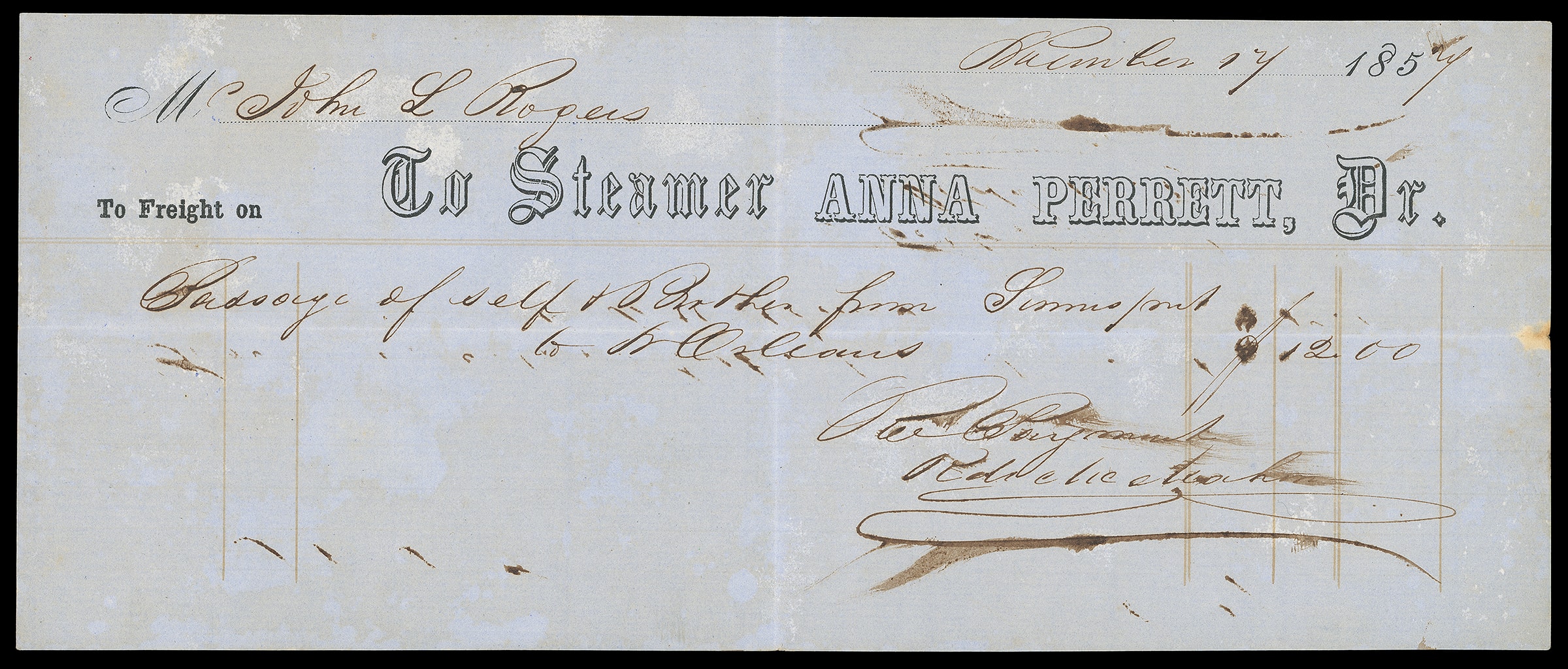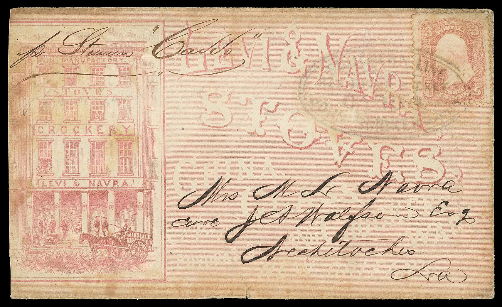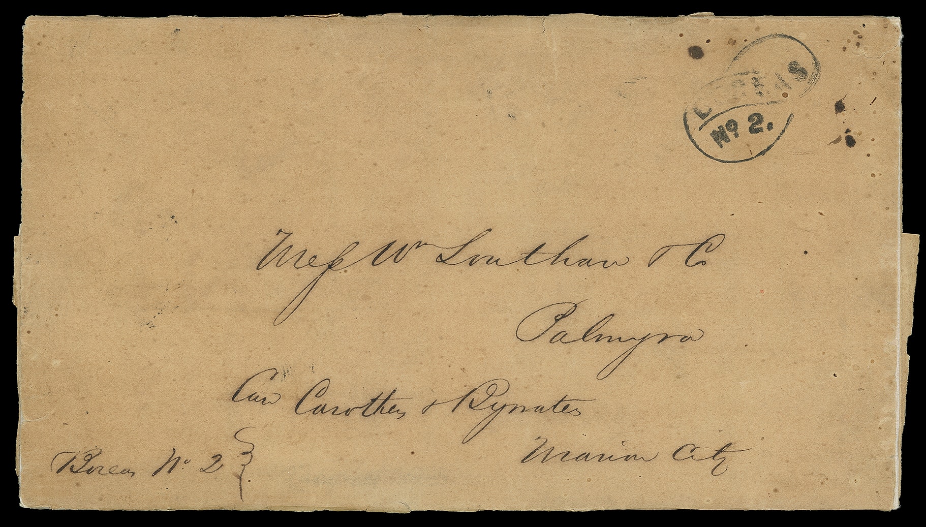 Perret. Well-struck red oval on gray 1858 folded letter from New Orleans La. to Opelousas La., also included is printed 1857 freight bill, Very Fine, ex-Somdal, Milgram. Milgram No. 56; Estimate $300 - 400.