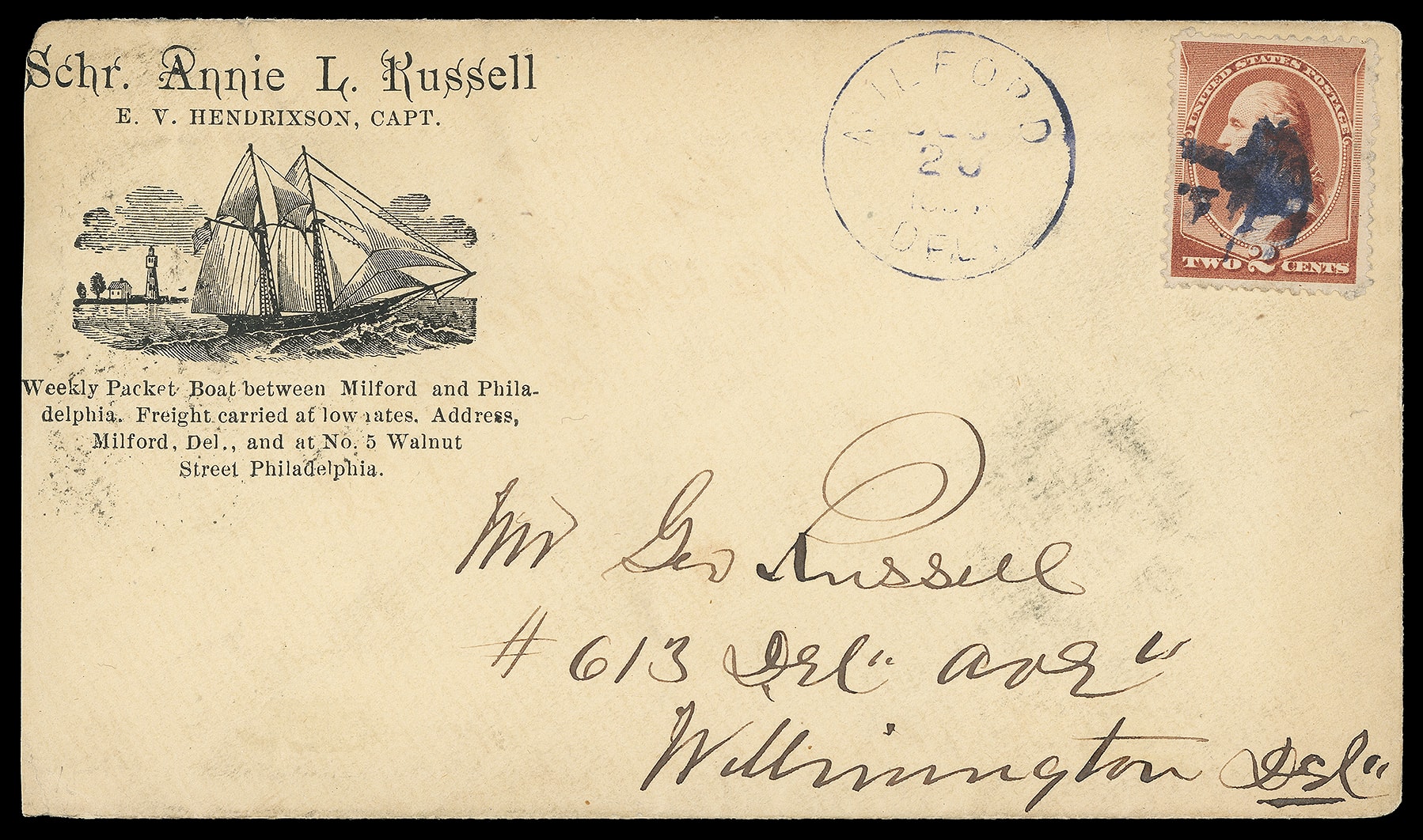 Russell. Illustrated corner card on amber cover bearing 2¢ red brown (210) cancelled by bluish black cork with matching "Milford, Del. Dec 20" cds to Washington D.C.; reduced at left, F.-V.F. Milgram No. 59; Estimate $50 - 75. (Image1)