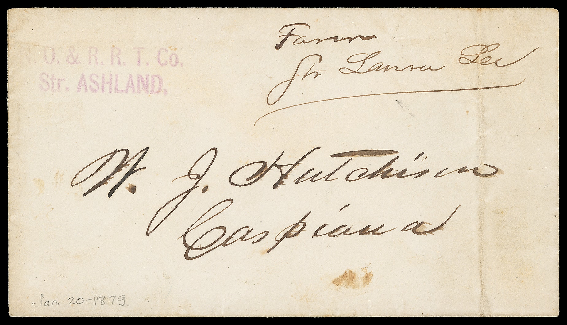 Purple two-line straightline on cover to Caspiana (La.), additional manuscript "From Str Laura Lee" endorsement at lower left; vertical file fold and small stain, also included is original enclosure written on board dated "1879", F.-V.F.,