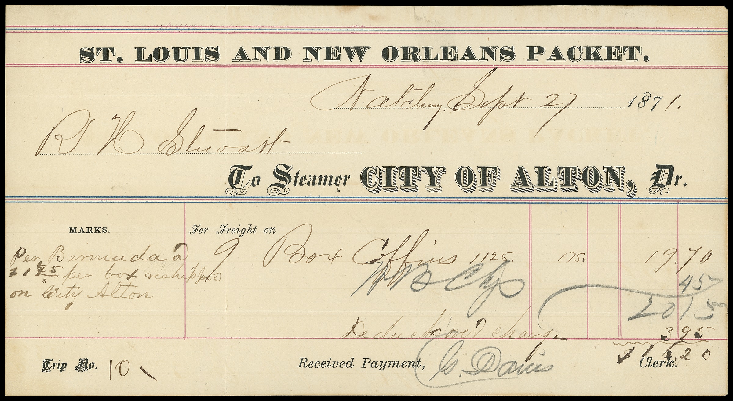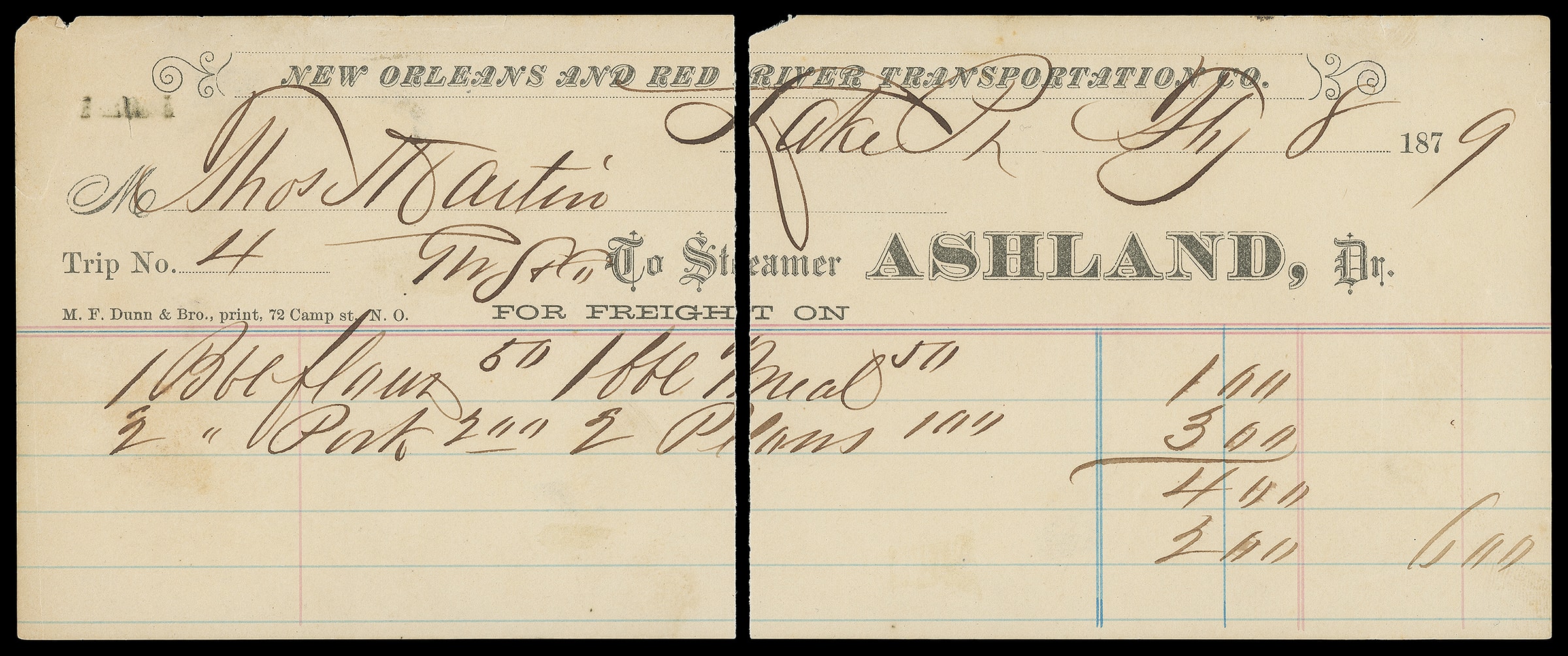 reduced at right, also includes 1871 printed freight bill, Very Fine. Milgram No. 226; Estimate $150 - 200. (Image1) (Image2)