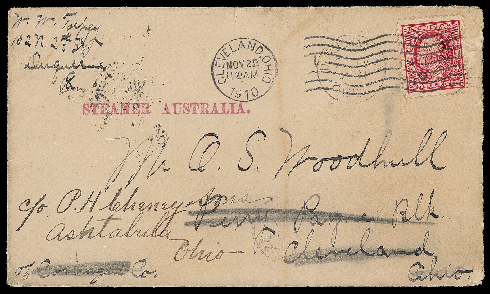 Australia. Complete magenta straightline on forwarded cover bearing 1908-10 2¢ Washington tied by "Duquesne, Pa. 21 Nov, 1910" duplex to Ashtabula, Ohio, forwarded with "Cleveland, O. Nov 22 1910" machine cnacel to Ashtabula Oh.; small edge