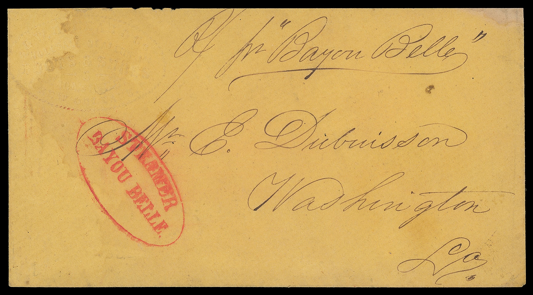 Regular Packet Caddo. Blue oval handstamp 3¢ rose (65) on rose overall illustrated cover to Natchitoches, La., reduced at left, soiling and wear, Fine and rare, ex-Somdal, Milgram. Milgram No. 155; Estimate $200 - 300.