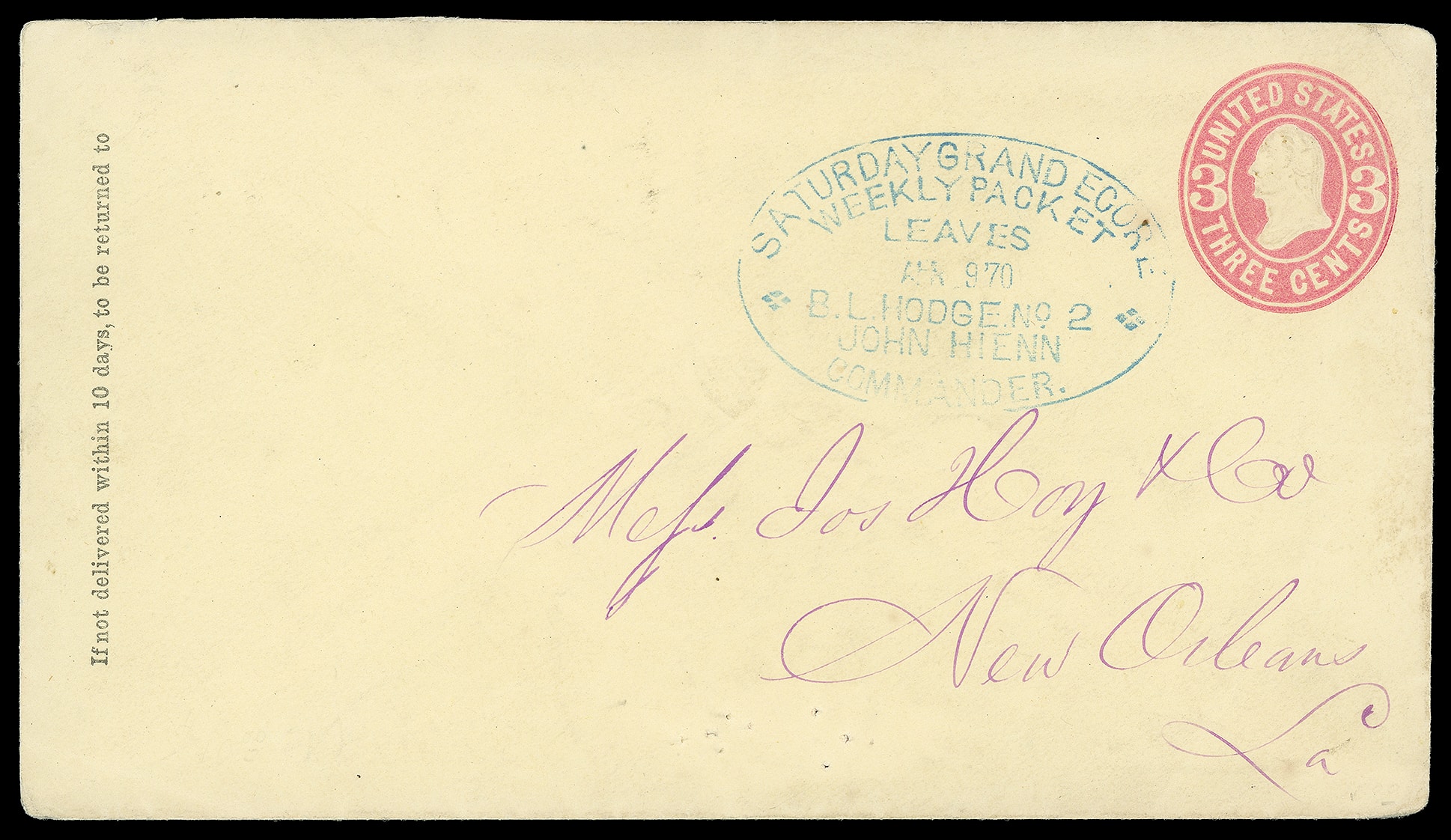 Ecore Weekly Packet, B.L. Hodge No.2. Blue Apr. 9th 1870 oval handstamp on 3¢ pink (U59) buff entire from the Hoy correspondence to New Orleans La., Very Fine, ex-Milgram. Milgram No. 127; Estimate $75 - 100. (Image1)