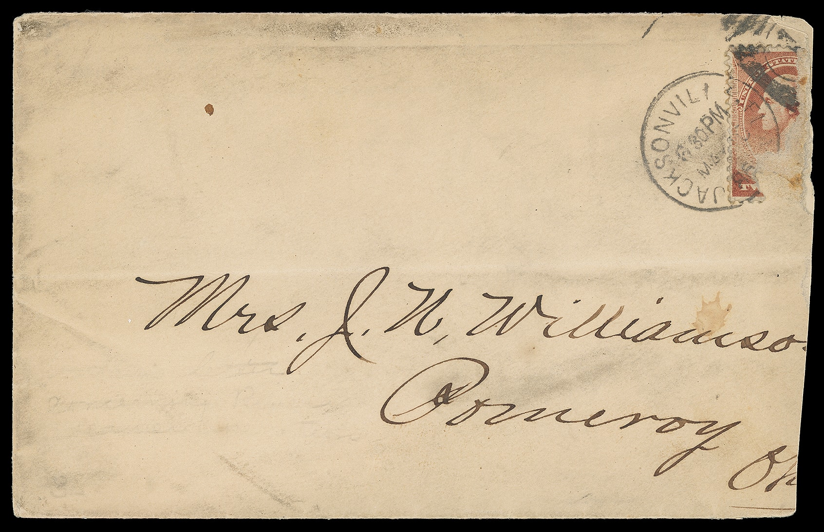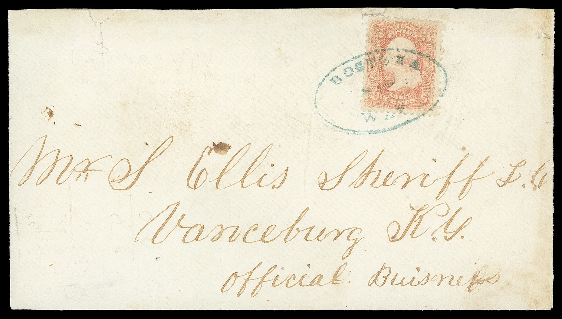 oval handstamp ties 3¢ rose (65) on cover to Vanceburg Ky.; refolded with small repaired top edge flaws, Very Fine appearance, ex-Milgram. Milgram No. 135; Estimate $150 - 200.