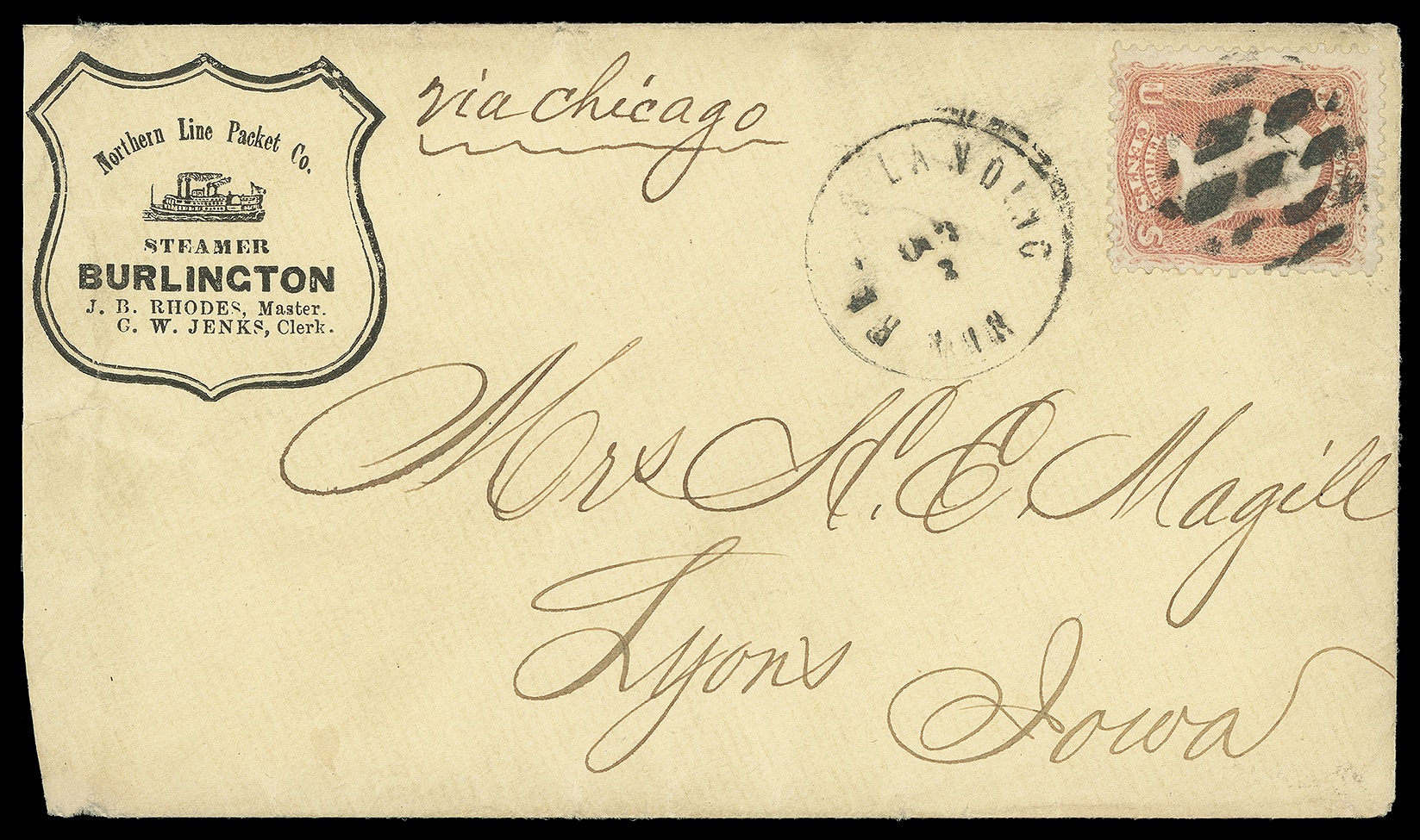 Burlington. Illustrated shield type corner card on amber cover bearing 3¢ rose (65) canceled by circular diamond grid duplexed with "Reeds Landing Min. Oct 1" cds to Lyons, Iowa; reduced at left, F.-V.F. Milgram No. 150; Estimate