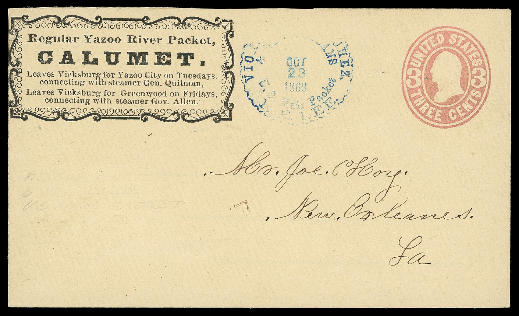 Packet Calumet. Black ornate corner card on 3¢ pink (U59) buff entire with additional blue R.E. Lee Oct. 23, 1868 (Milgram 1177) ornate scalloped steamboat handstamp to New Orleans; mended tear affecting corner card, still Very