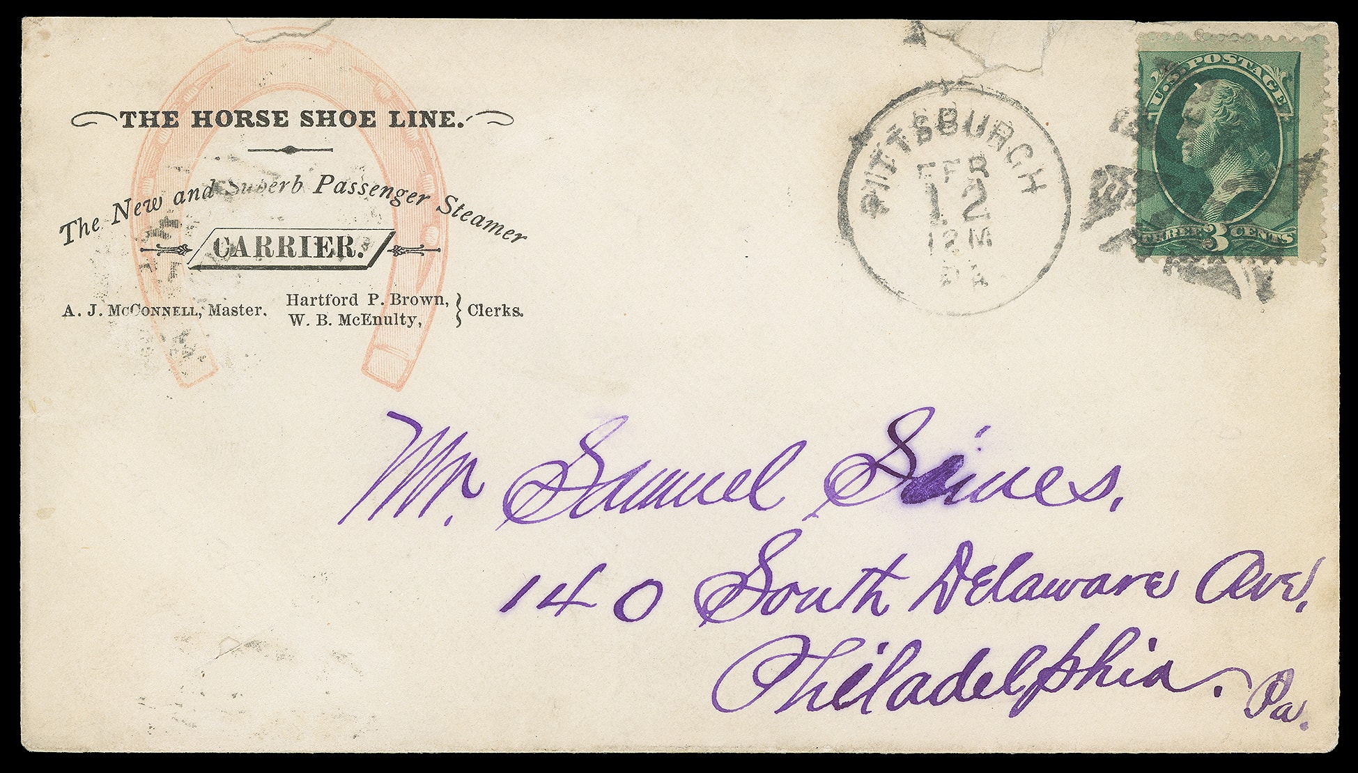 Passenger Steamer Carrier. Bicolored illustrated Horse Shoe corner card on cover bearing 3¢ green (158) tied by squared circle of wedges duplexed with "Pittsburgh Pa. Feb 12" cds to Philadelphia, Pa.; edge tears at top, F.-V.F. and