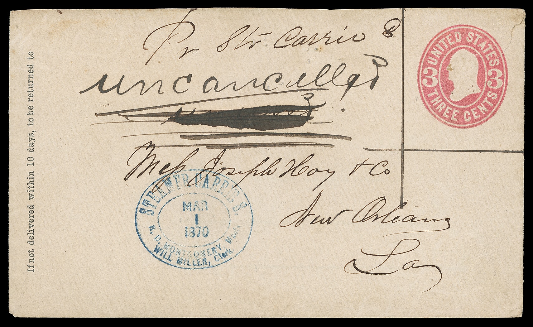 Mar 1 1870. Blue double-oval datestamp on 3¢ pink (U58) entire to New Orleans, endorsed "Pr. Steamer Carrie S." at top and "Uncancelled" notation; corner tear just affects indicia, otherwise F.-V.F. Milgram No. 181;