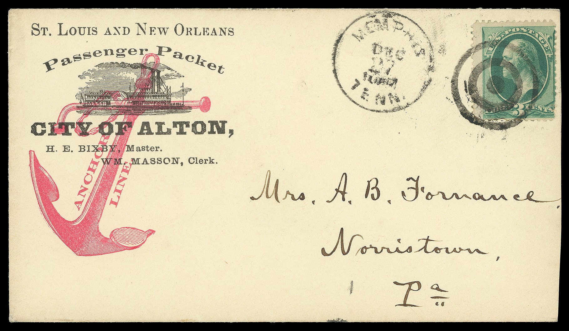 Orleans Passenger Packet City of Alton. Bicolored illustrated corner card featuring red Anchor (Anchor Line) on cover bearing 3¢ green (158) tied by large target cancel duplexed with "Memphis, Tenn. Dec 27" cds to Morristown Pa.; barely