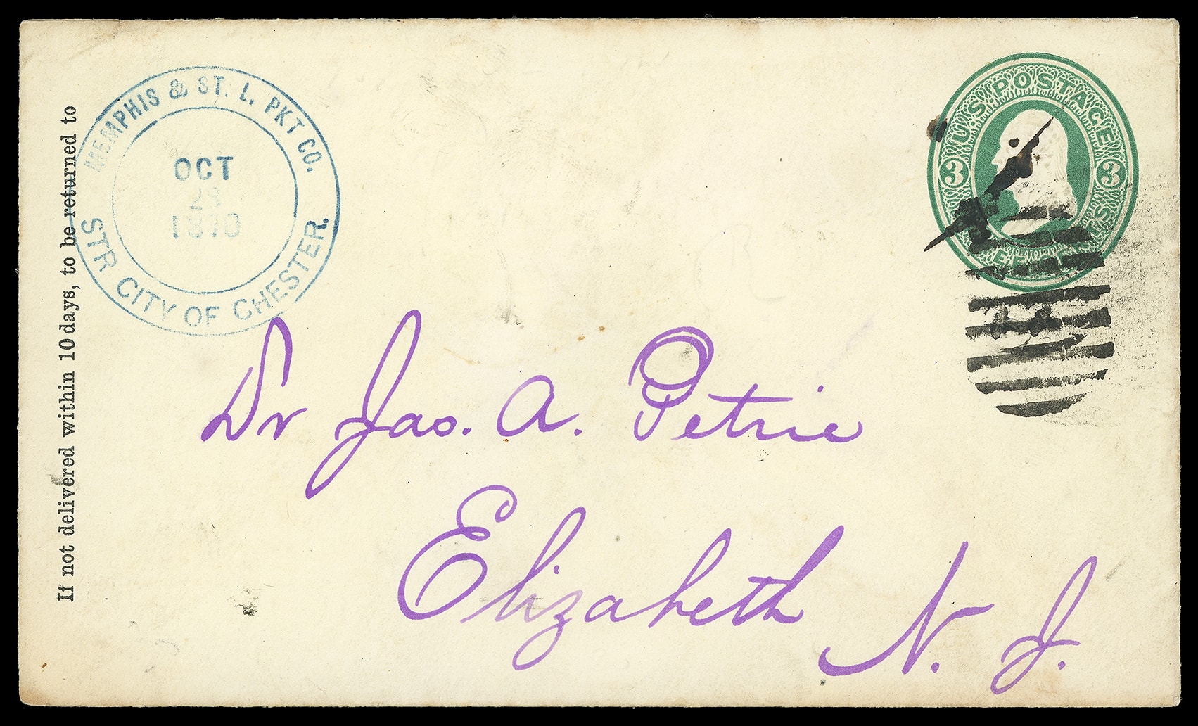 Pkt.Co. Str. City of Chester, Oct. 28 1879. Blue double-circle datestamp on 3¢ green (U83) entire canceled by manuscript stroke and oval grid to Elizabeth N.J., Very Fine, only recorded example,