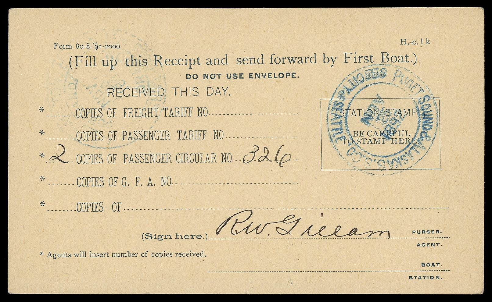 Alaska S.S. Co., Ster. City of Seattle, Nov. 25 1892. Blue double-circle datestamp on reverse of card addressed to Agent of the Puget Sound & Alaska Steamship Co. in Tacoma Wash., forwarded to Portland with violet boxed handstamp "Forwarded by