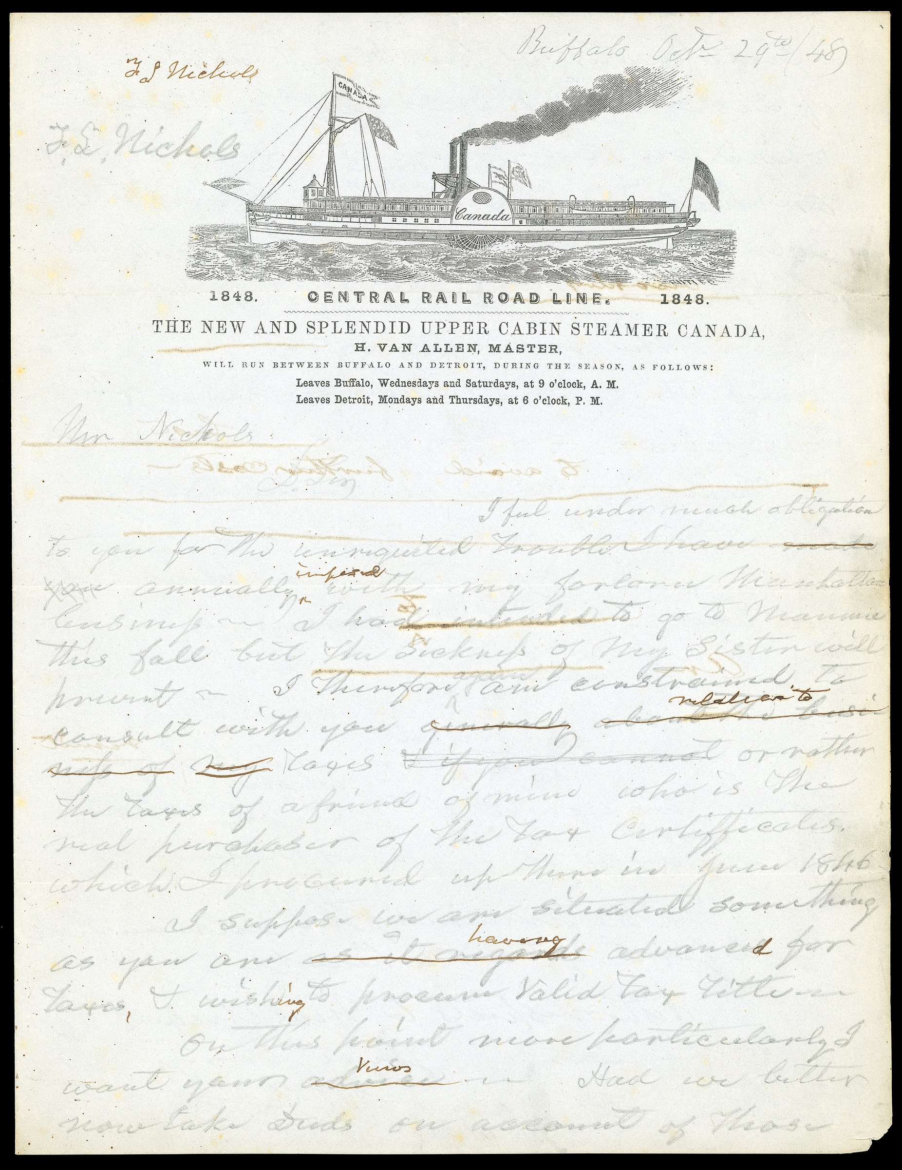 (Great Lakes). Folded lettersheet with lovely illustrated design of the Steamer Canada datelined "Buffalo Oct. 29, '48"; some minor edge flaws, Very Fine and rare, the only recorded example. Estimate; $400 - 600. (Image1) (Image2)