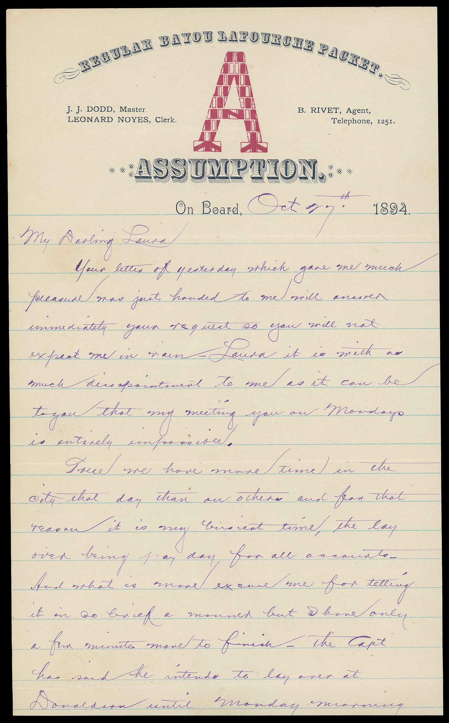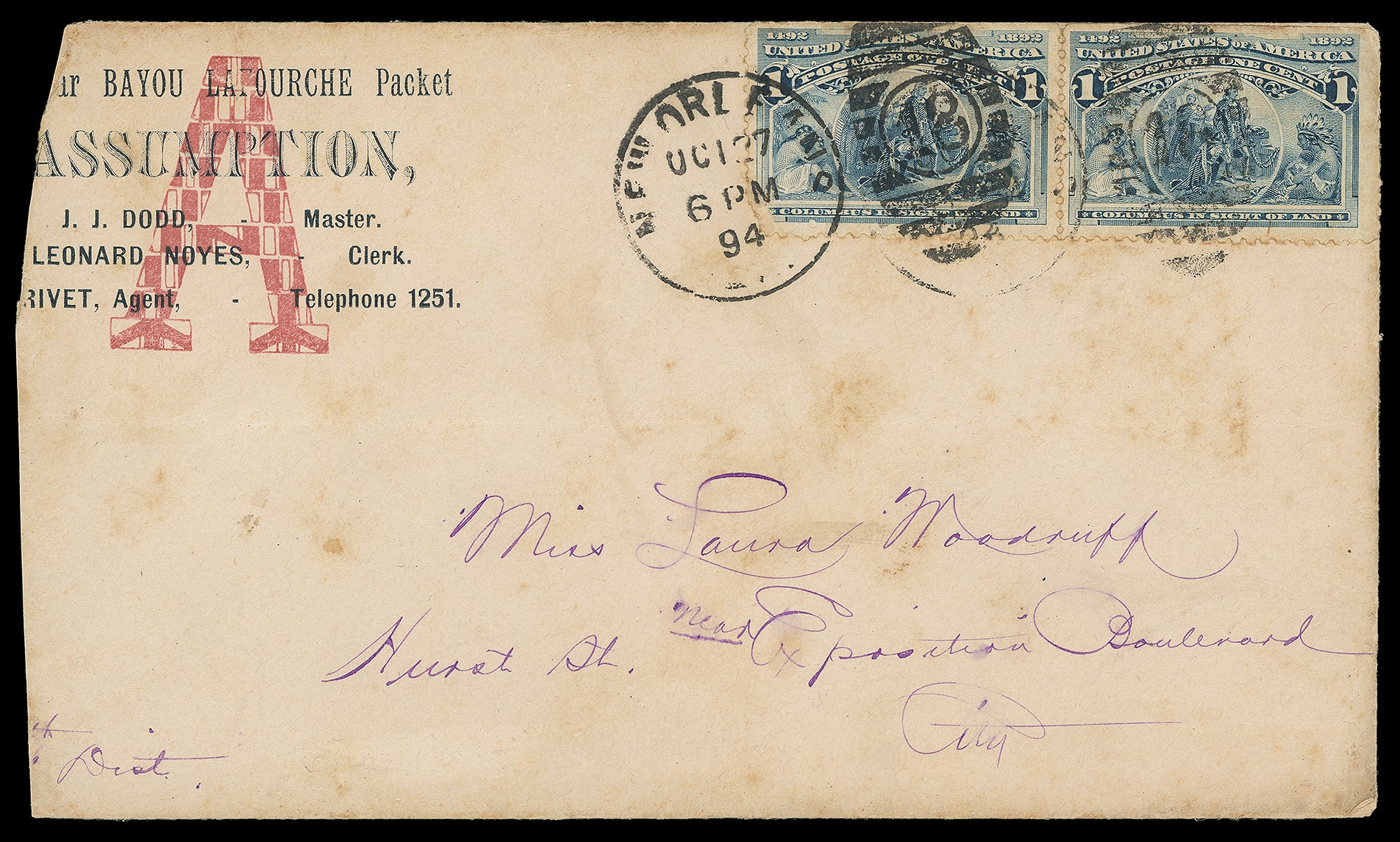 LaFourche Packet, Assumption (Bayou LaFourche). Printed corner card with large red letter "A" on cover bearing faulty 1¢ Columbian (230) pair tied by to New Orleans La., includes original enclosure on matching letterhead; cover reduced at