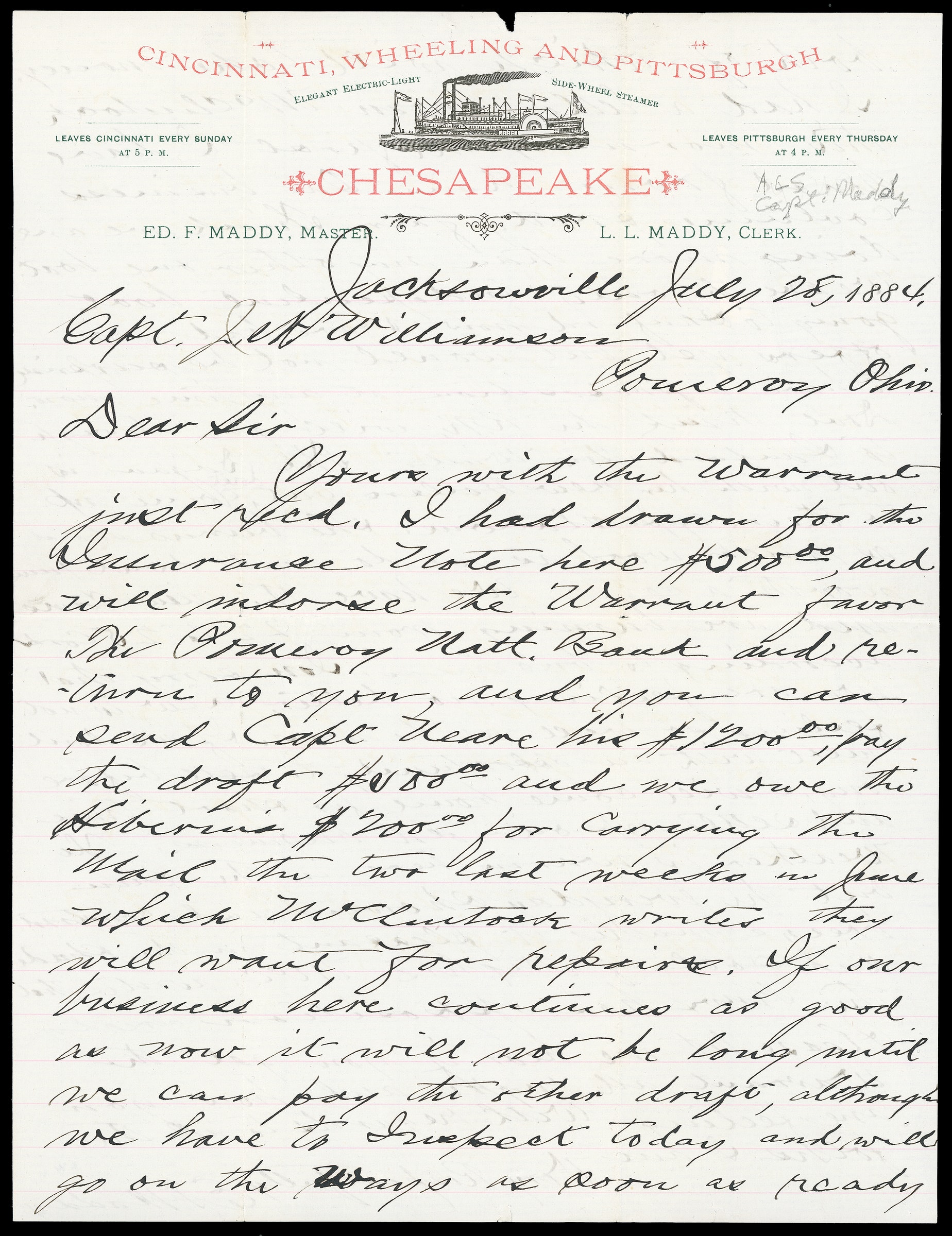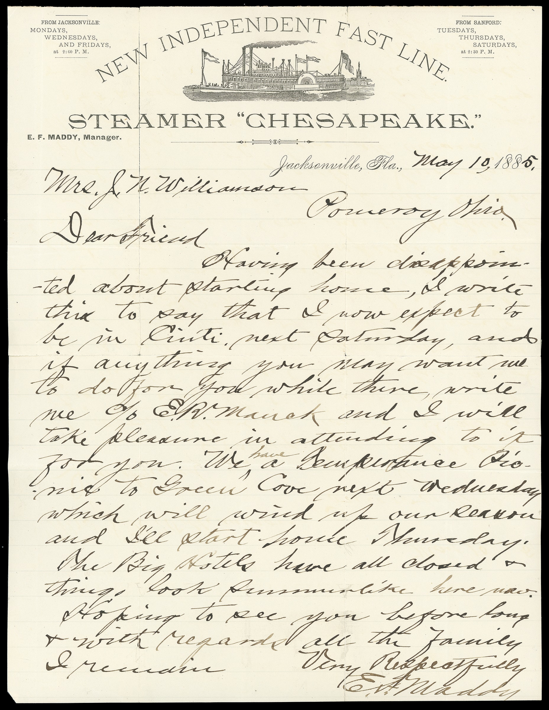 (St. John's River). Two beautifully 1884 and 1885 illustrated lettersheets from Jacksonville, Fla., included is original defective cover for the 1885 letter, F.-V.F. and scarce group, Unlisted in Milgram. Milgram No. 217A; Estimate