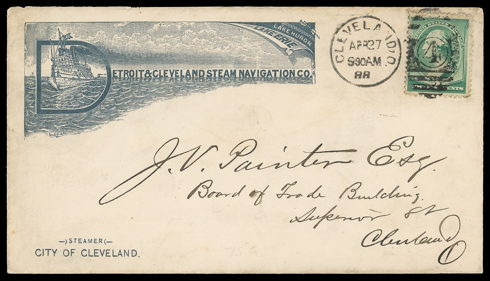 Steam Navigation Co. Steamer City of Cleveland (Great Lakes). Blue gray imprint at bottom left with large illustrated corner card of Detroit & Cleveland Steam Navigation Co. on cover bearing 2¢ green (213) tied by "Cleveland, O. Apr 27 '88"