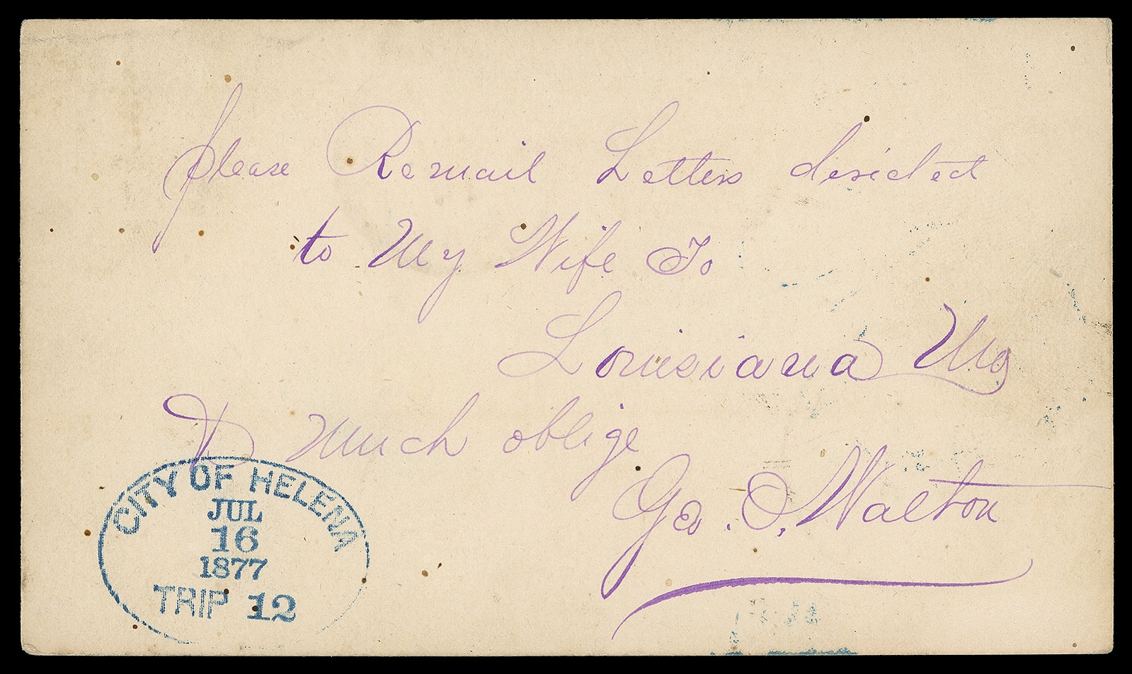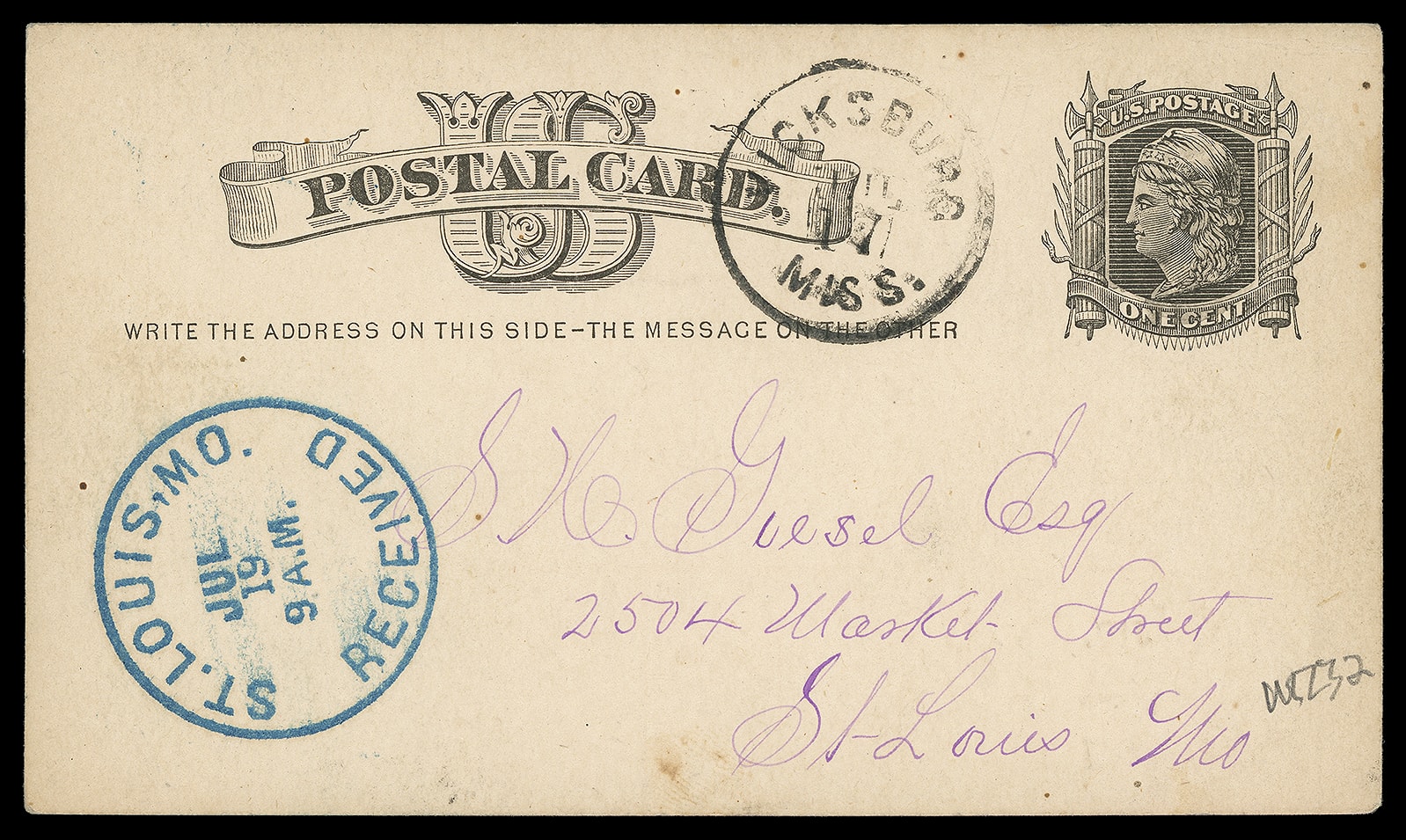 16 1877, Trip 12 (Mississippi River). Blue oval datestamp on reverse of 1¢ postal card canceled by "Vicksburg, Miss. Jul 17" cds to St. Louis Mo., perfect strike of bold blue "St. Louis, Mo., Received, Jul 19" arrival cds, Very Fine,
