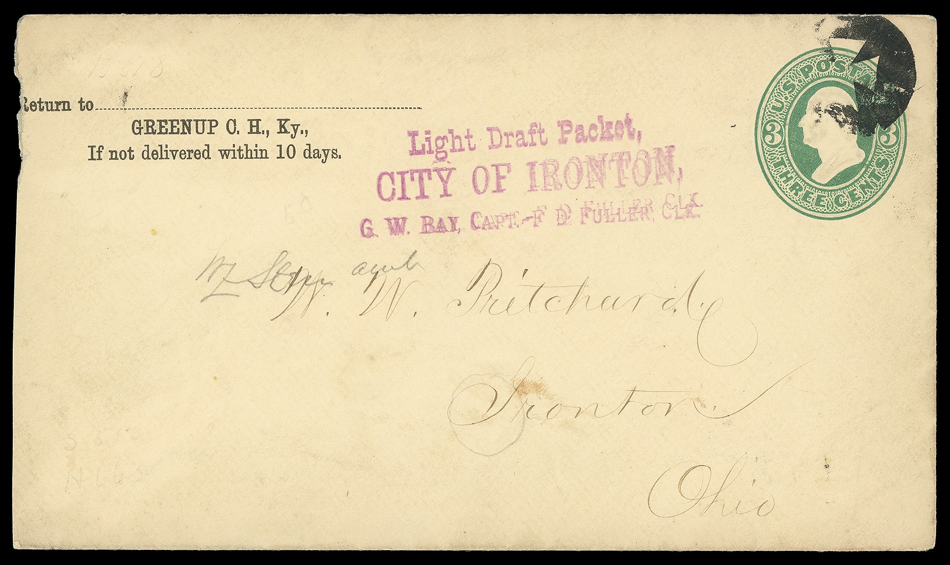 Ironton. Purple three-line straightline on 3¢ green entire canceled by partial negative Iron Cross killer to Ironton, Ohio; slightly trimmed at left, otherwise Very Fine, only recorded example,