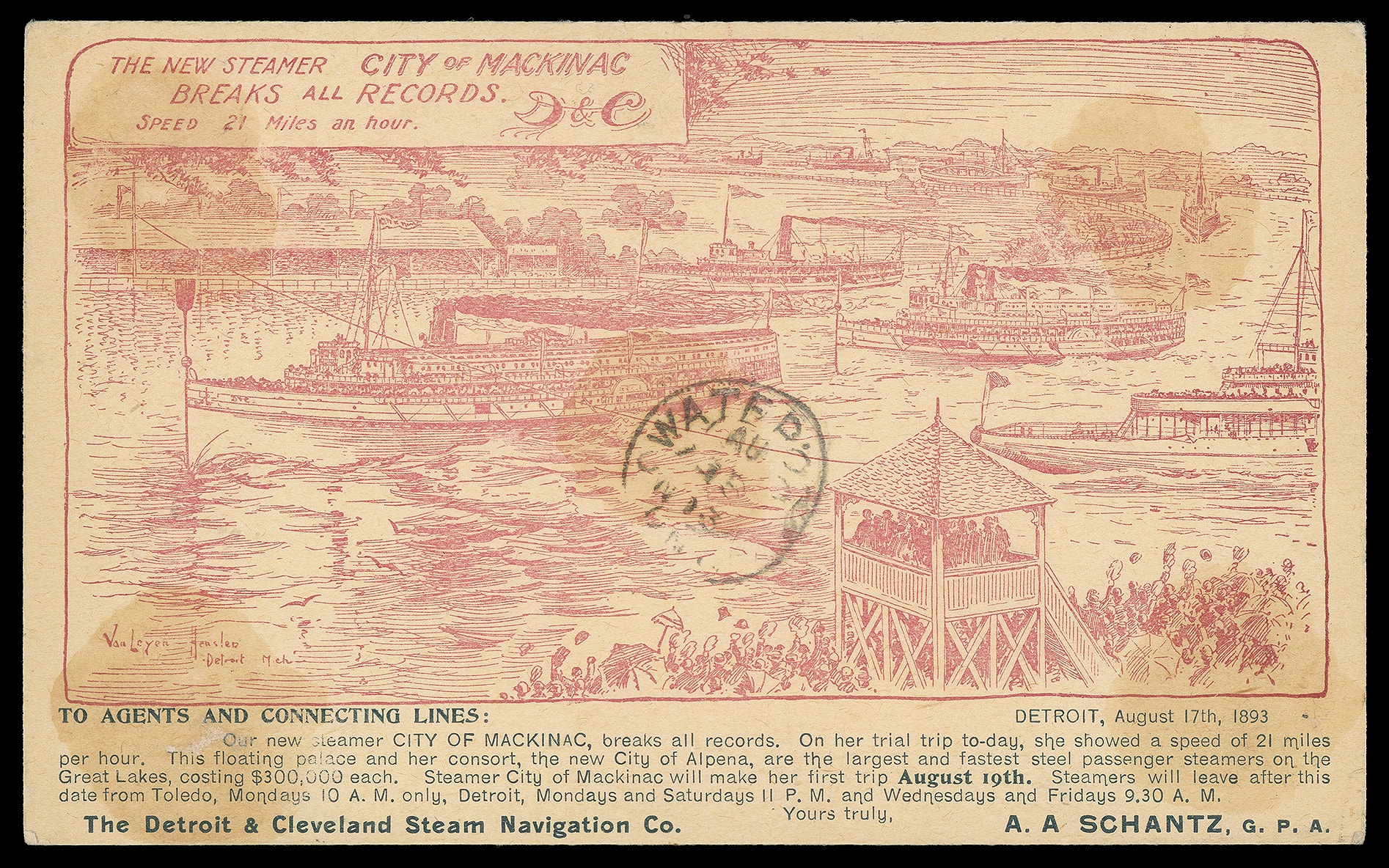 City of Mackinac, Breaks All Records. Rose overall illustrated design shows showing the race of the City of Mackinac with several other steamers trailing on 1¢ postal card canceled by "Detroit, Mich. Aug. 17, 1893" machine cancel to