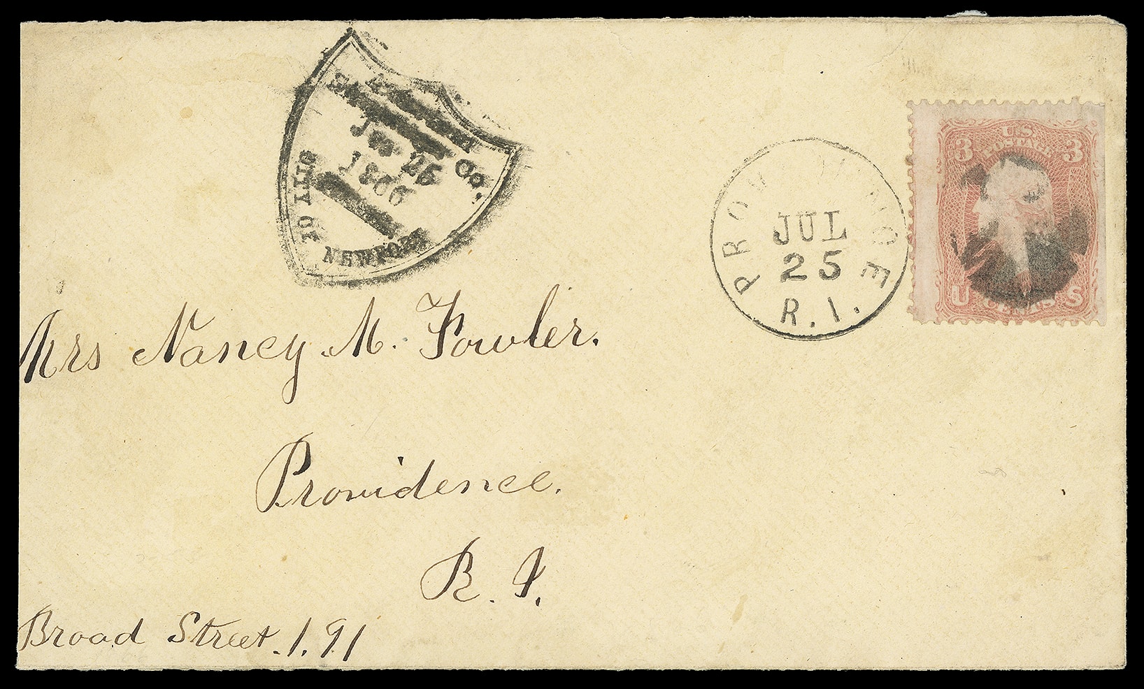 Newport. Fancy shield type handstamp on amber cover bearing 3¢ rose (65) s.e. tied by "Providence, R.I. Jul 25" cds duplexed with cork cancel to Providence R.I.; reduced at left, F.-V.F. and only recorded example,