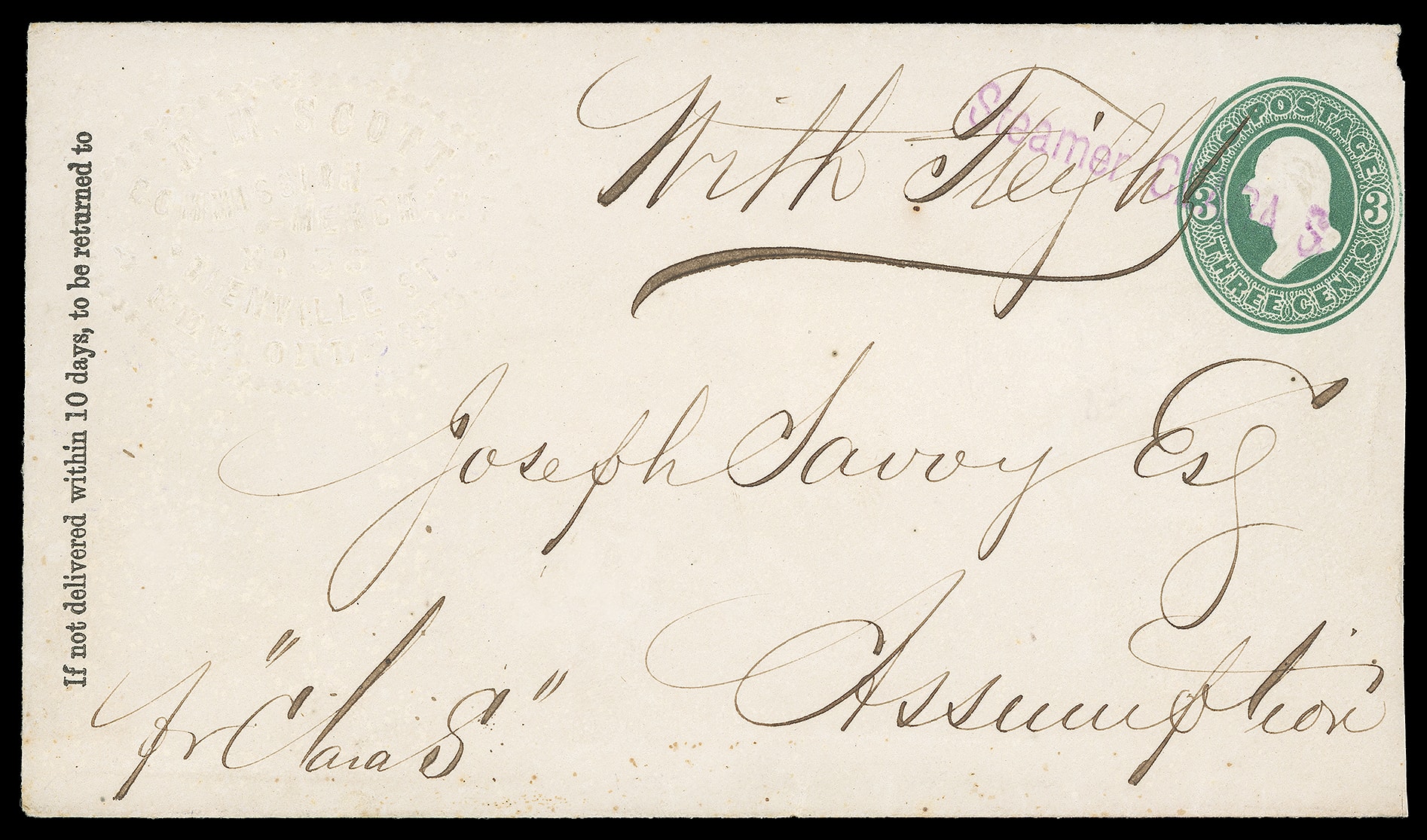 S. Purple straightline across indicia of 3¢ green entire with embossed "E.M. Scott, Commission Merchant, New Orleans" corner card to Assumption La., endorsed "With Freight" at top; slightly reduced at right with small corner chip at top,