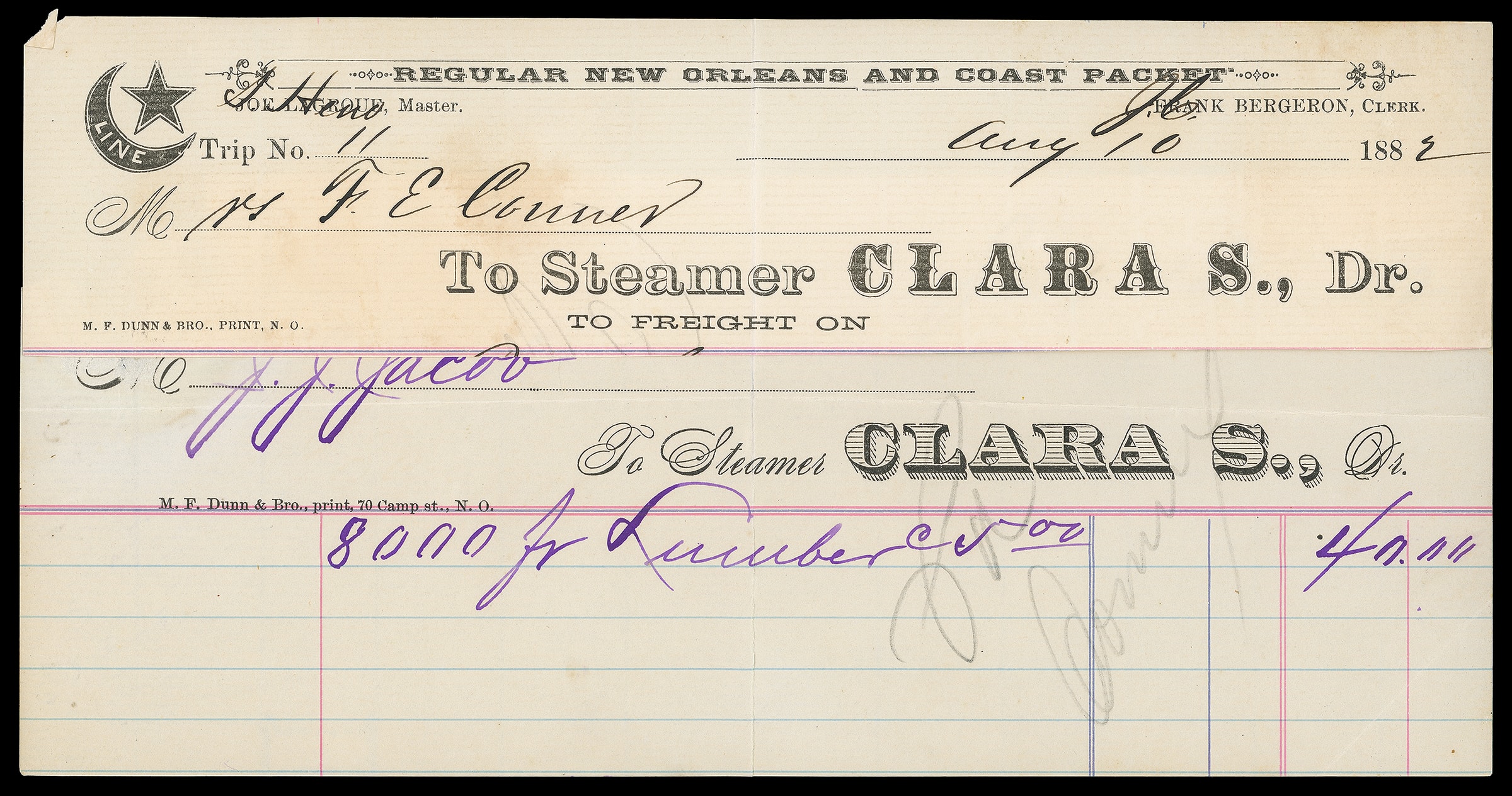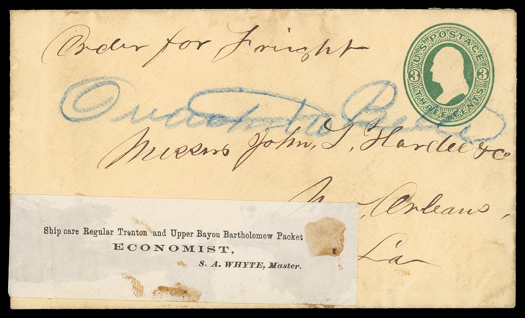 Trenton and Upper Bayou Bartholomew Packet Economist (Ouachita River). Printed label affixed on 3¢ green (U84) cream entire to New Orleans La., manuscript "Order for Freight" and blue crayon marking "Ouachita Belle", also included is 1870