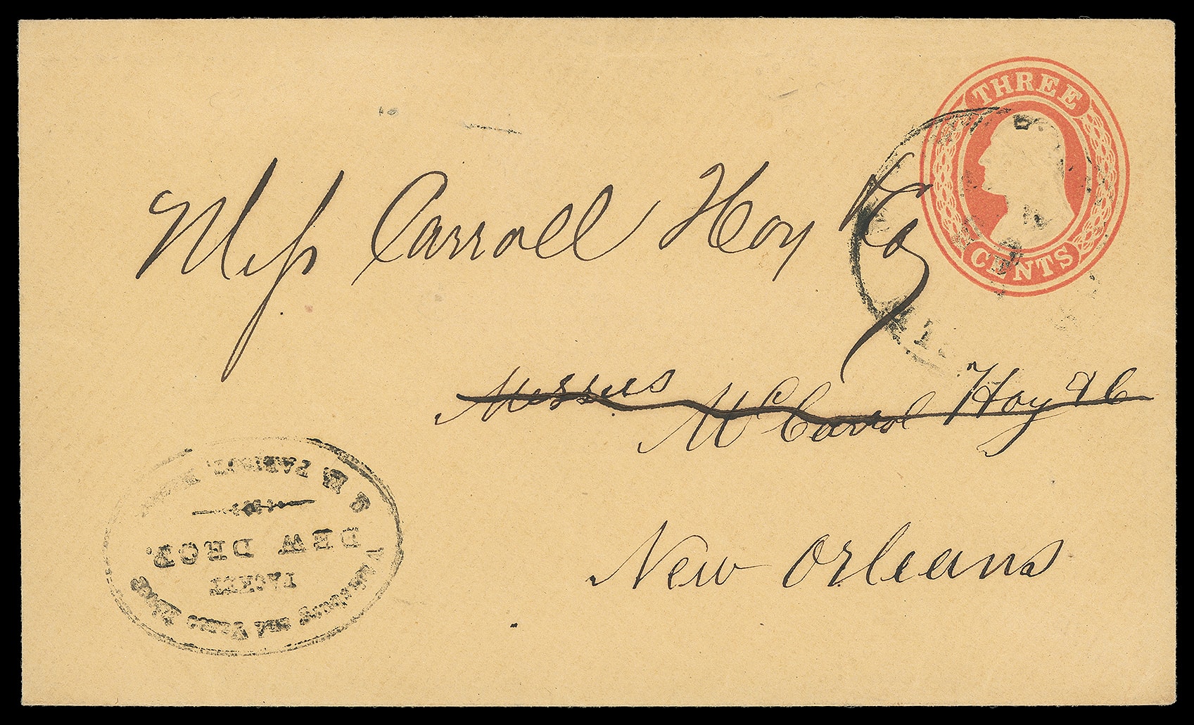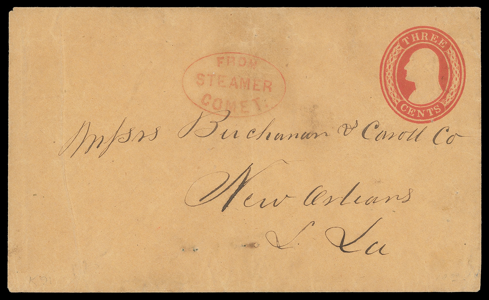 Comet. Red oval handstamp on 3¢ red (U10) buff Nesbitt entire from Buchannon Carroll Co. to New Orleans; typical filing holes, some light wrinkles, Very Fine. Milgram No. 274; Estimate $200 - 300. (Image1)