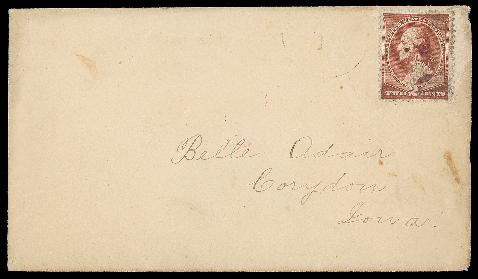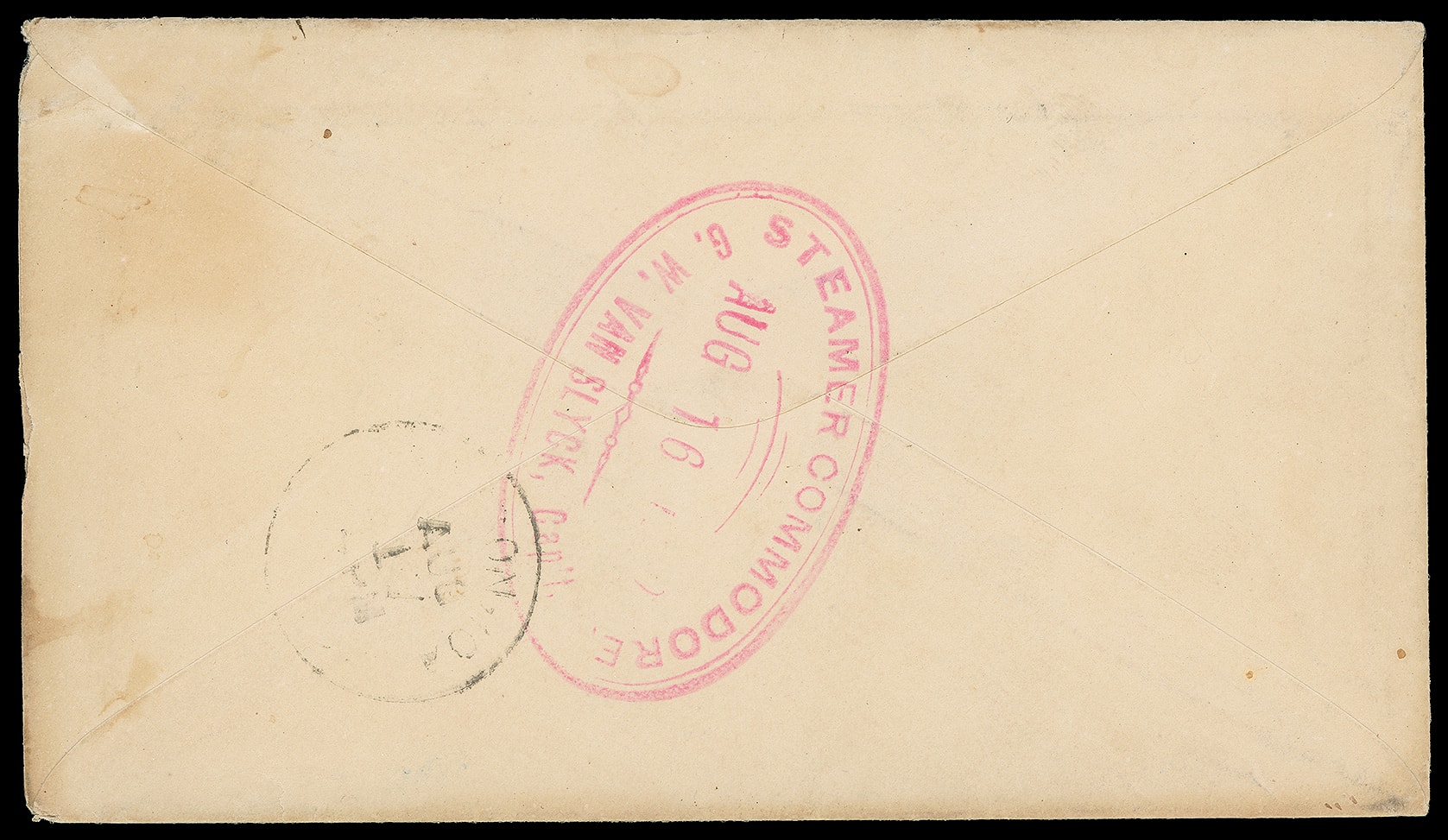 Commodore. Magenta oval handstamp on reverse of cover bearing 2¢ red brown (210) that may not belong with indistinct cds to Corydon, Iowa; reduced slightly at left, Fine and scarce. Milgram No. 278; Estimate $75 - 100. (Image1) (Image2)