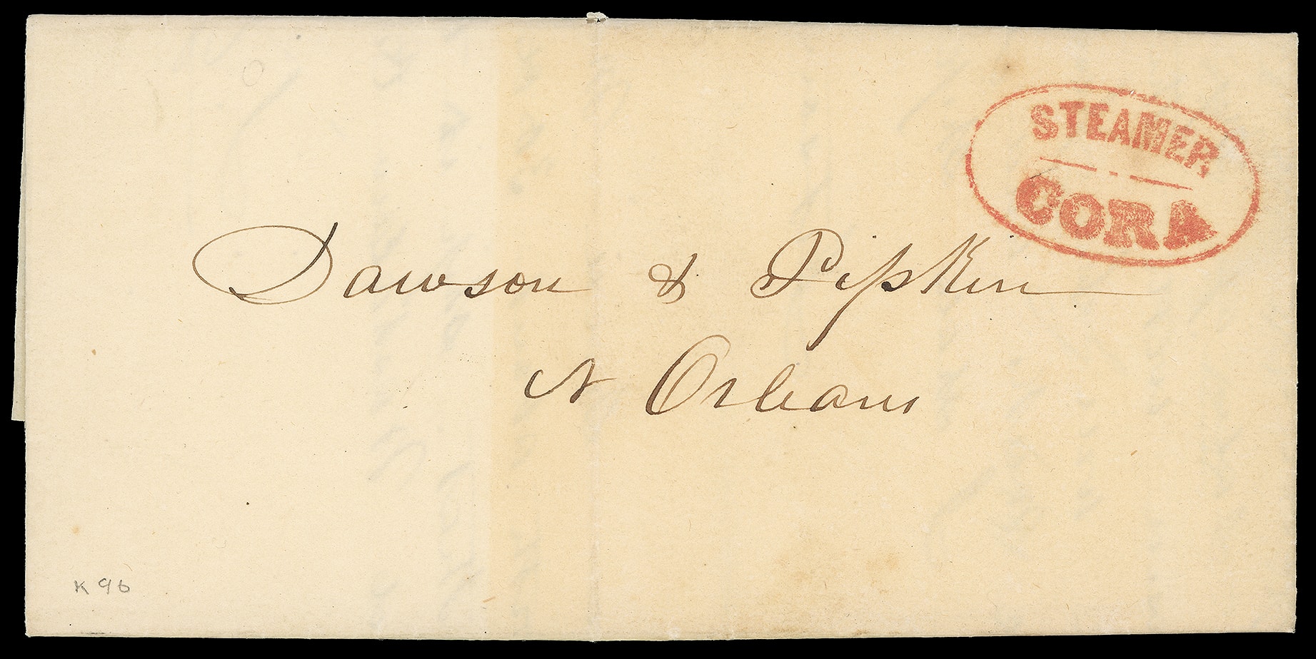 Red oval handstamp on folded letter datelined "Vernon (Ala.) Jan 23rd 1852" to Mobile Ala., partial "Steam 5" rating oval, F.-V.F. and scarce. Milgram No. 420; Estimate $150 - 200.