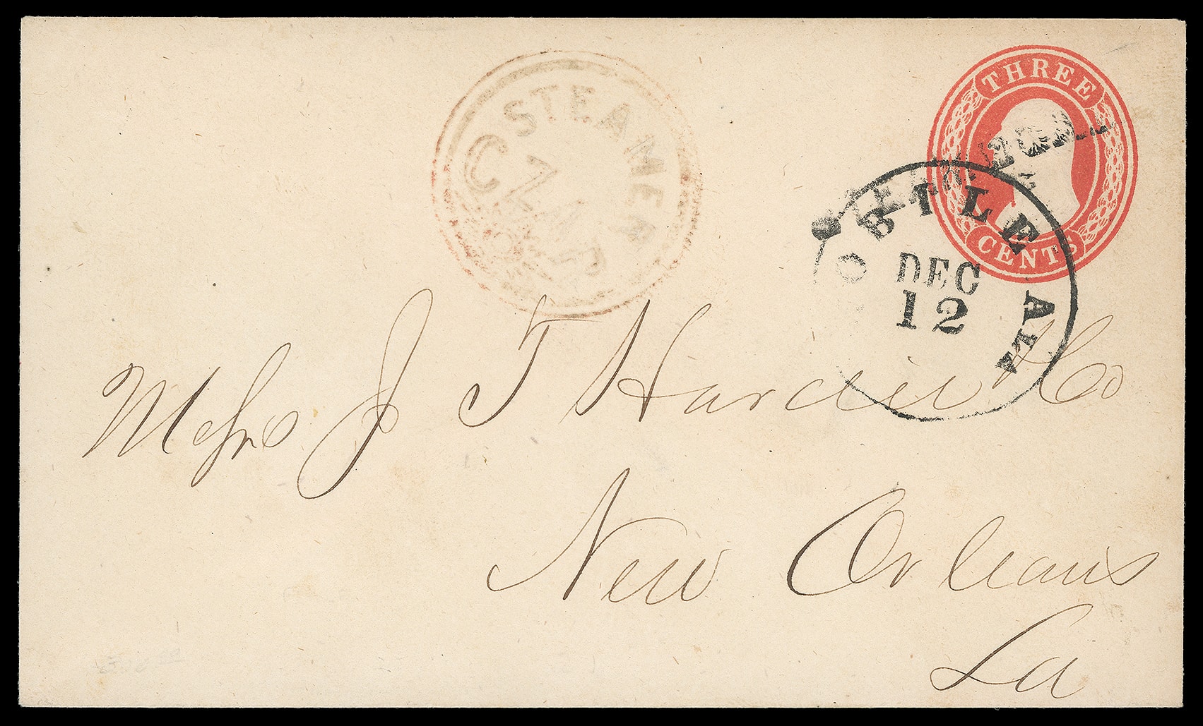 Red circular handstamp on 3¢ red (U9) Nesbitt entire canceled by "Mobile, Ala. Dec 12" cds with "Steamboat" straightline across indicia to New Orleans, Very Fine, the only recorded example, ex-Barkhausen, Somdal,