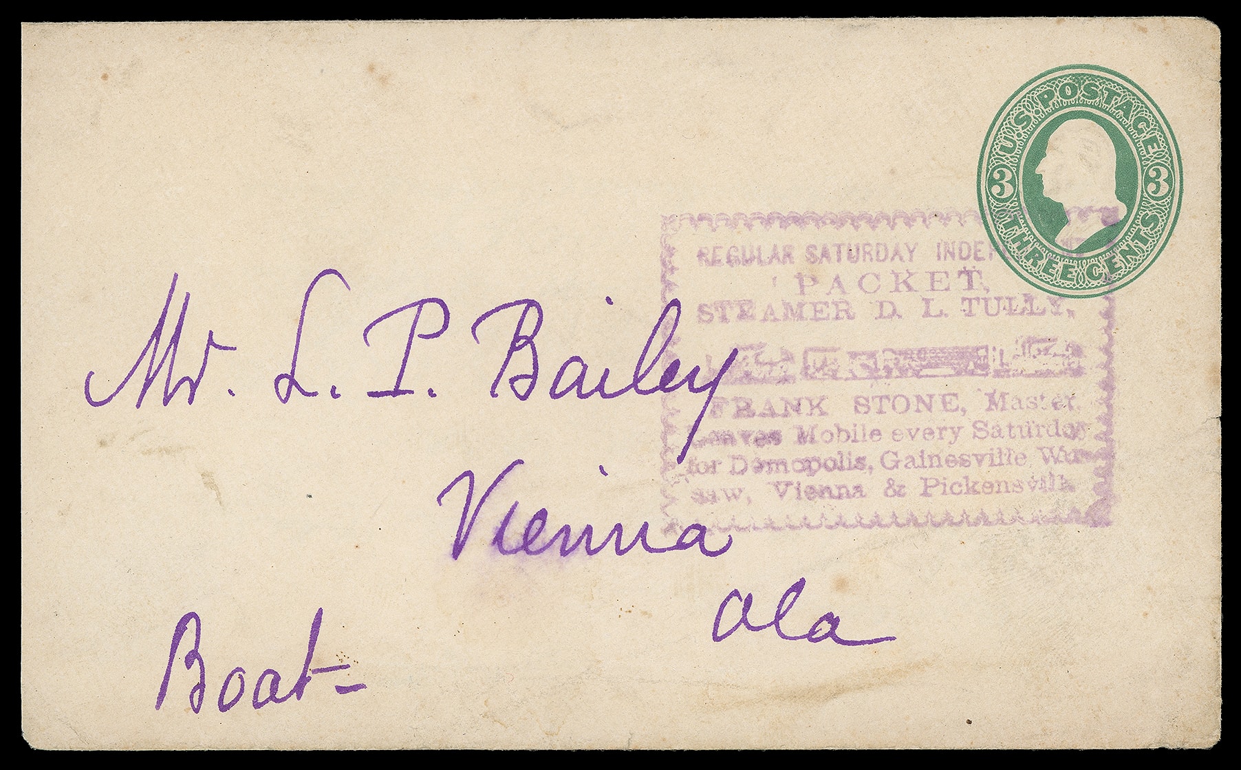 Tully (Alabama River). Purple eight-line illustrated fancy boxed handstamp showing Steamboats & Train on 3¢ green entire to Vienna, Alabama; reduced at left, Very Fine, the only recorded example, ex-Somdal,