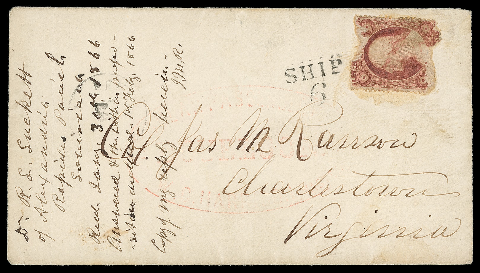 Packet Doubloon (Mississippi and Red Rivers). Faint strike of red oval handstamp on 1866 cover from Alexandria La. to Charlestown Va. bearing demonetized 3¢ dull red (26) that has been partially torn off, entered mails with "New