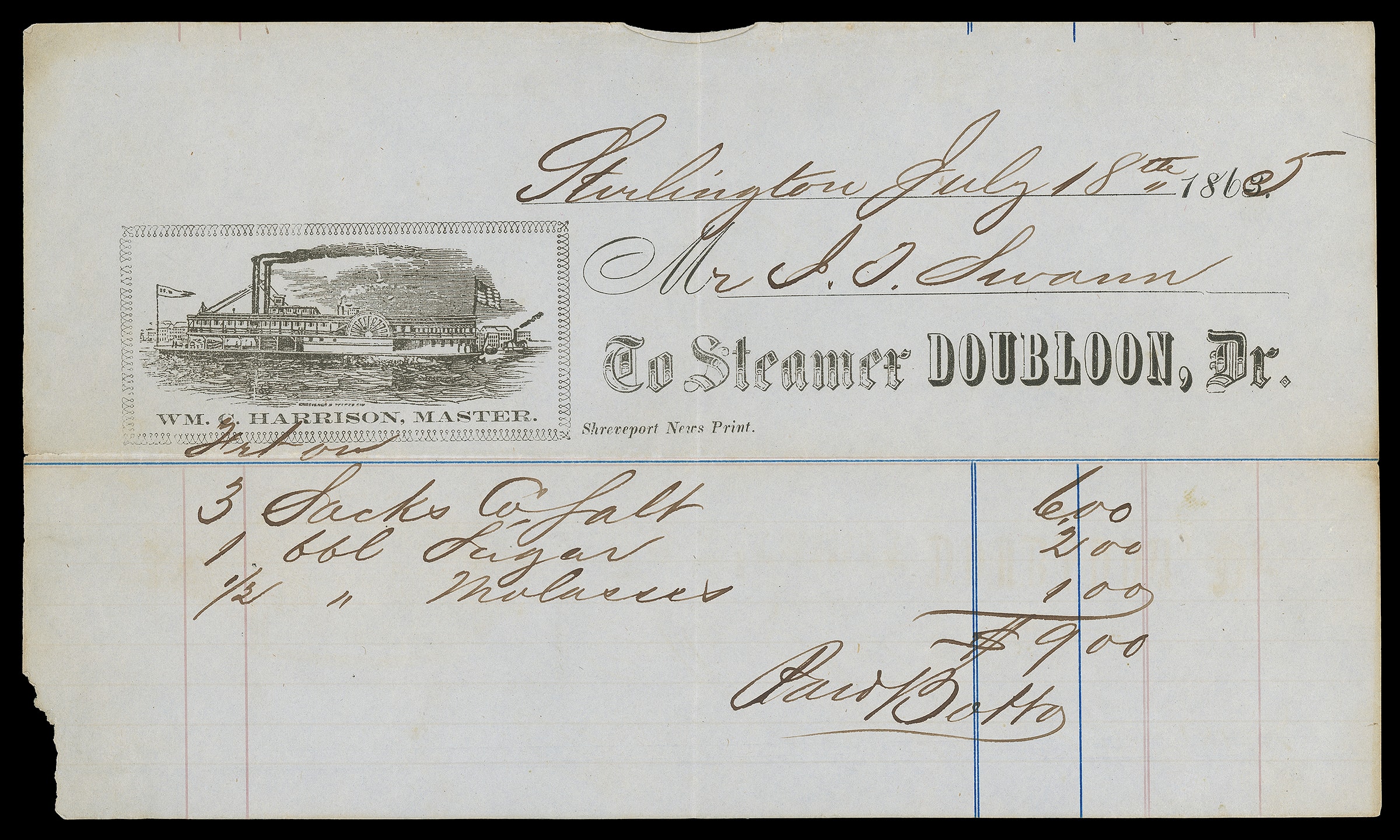 printed freight bill, Very Fine, one of the few steamboats to use a label, ex-Milgram. Milgram No. 387; Estimate $200 - 300.