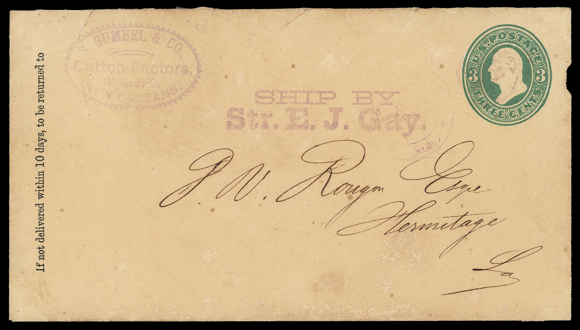 Gay. Purple two line straightline on 3¢ green entire to Hermitage, La.; small edge chip at right and couple small tears at top, F.-V.F. and unlisted in Milgram, the only recorded example, ex-Milgram. Milgram No.