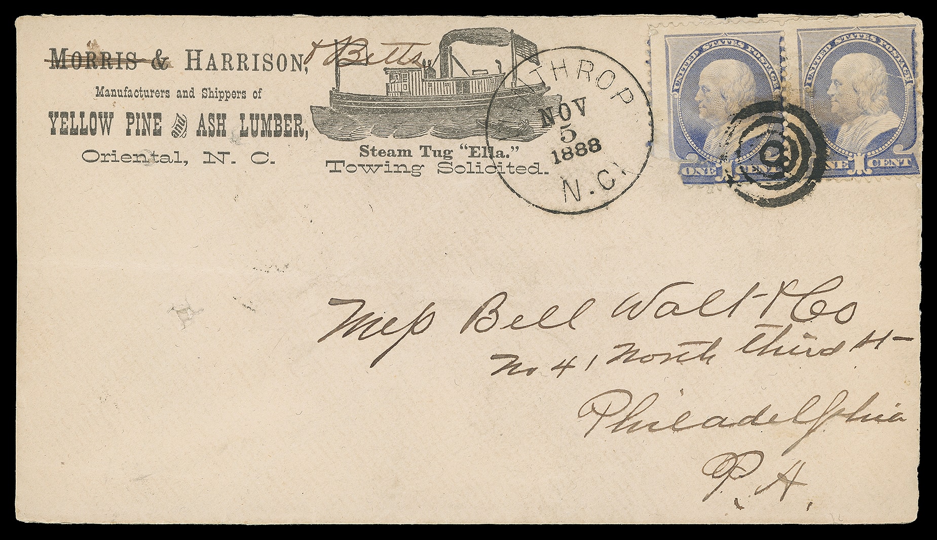 Printed illustrated corner card Tug Boat "Ella" on cover bearing 1¢ ultramarine (212) pair tied by target cancel duplexed with "Winthtrop N.C., Nov 5, 1888" cds to Philadelphia Pa.et & "Winthrop, N.C. Nov 5 1888" cds; 1¢ pair faulty,
