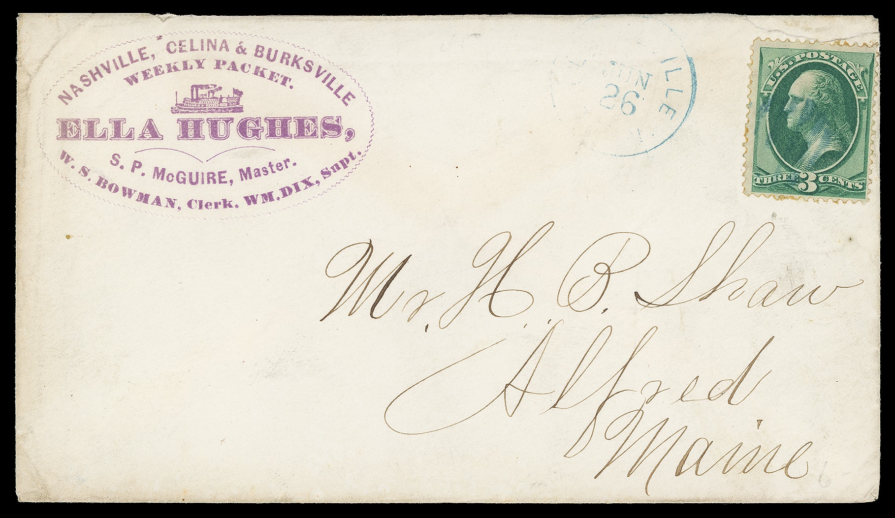 Burksville Weekly Packet, Ella Hughes (Cumberland River). Purple fancy illustrated corner card on cover bearing 3¢ green (147) canceled by blue grid duplexed with partial "Nashville Ten. Jun 26" cds from H.B. Shaw correspondence to Alfred