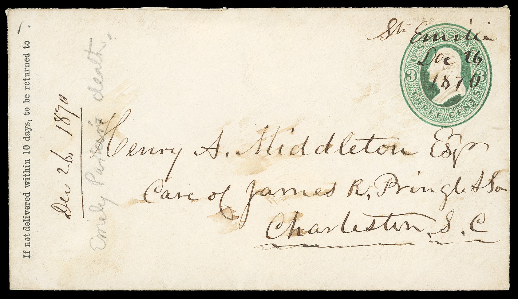 26, 1870 (Coastal Route). Manuscript cancel on 3¢ green (U82) entire to Charleston S.C., 1870 docketing at left, Very Fine and rare, unlisted in Milgram, ex-Milgram. Milgram No. 404A; Estimate $150 - 200. (Image1)