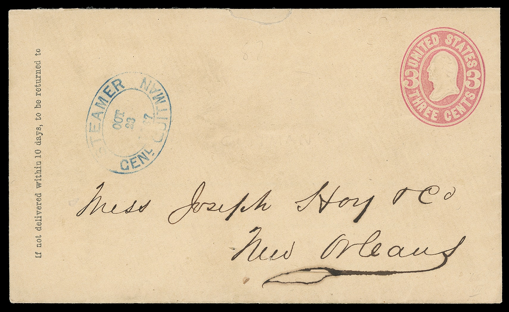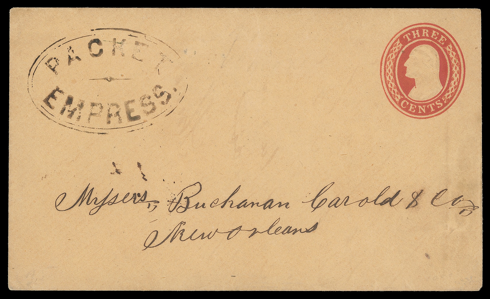 Oval handstamp on 3¢ red (U10) buff Nesbitt entire from the Buchanan Caroll correspondence to New Orleans La., Very Fine, ex-Milgram. Milgram No. 421; Estimate $200 - 300. (Image1)