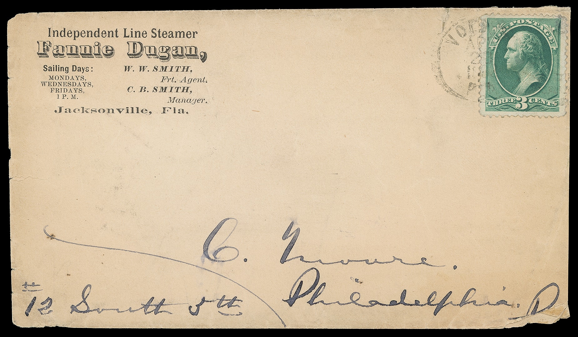 Steamer Fannie Dugan (St. John's River, Florida). Printed corner card on cover bearing 3¢ green (184) tied by "Volusia, Fla. Apr 23, 1883" cds to Philadelphia Pa.; small edge flaws, F.-V.F. and attractive early Florida