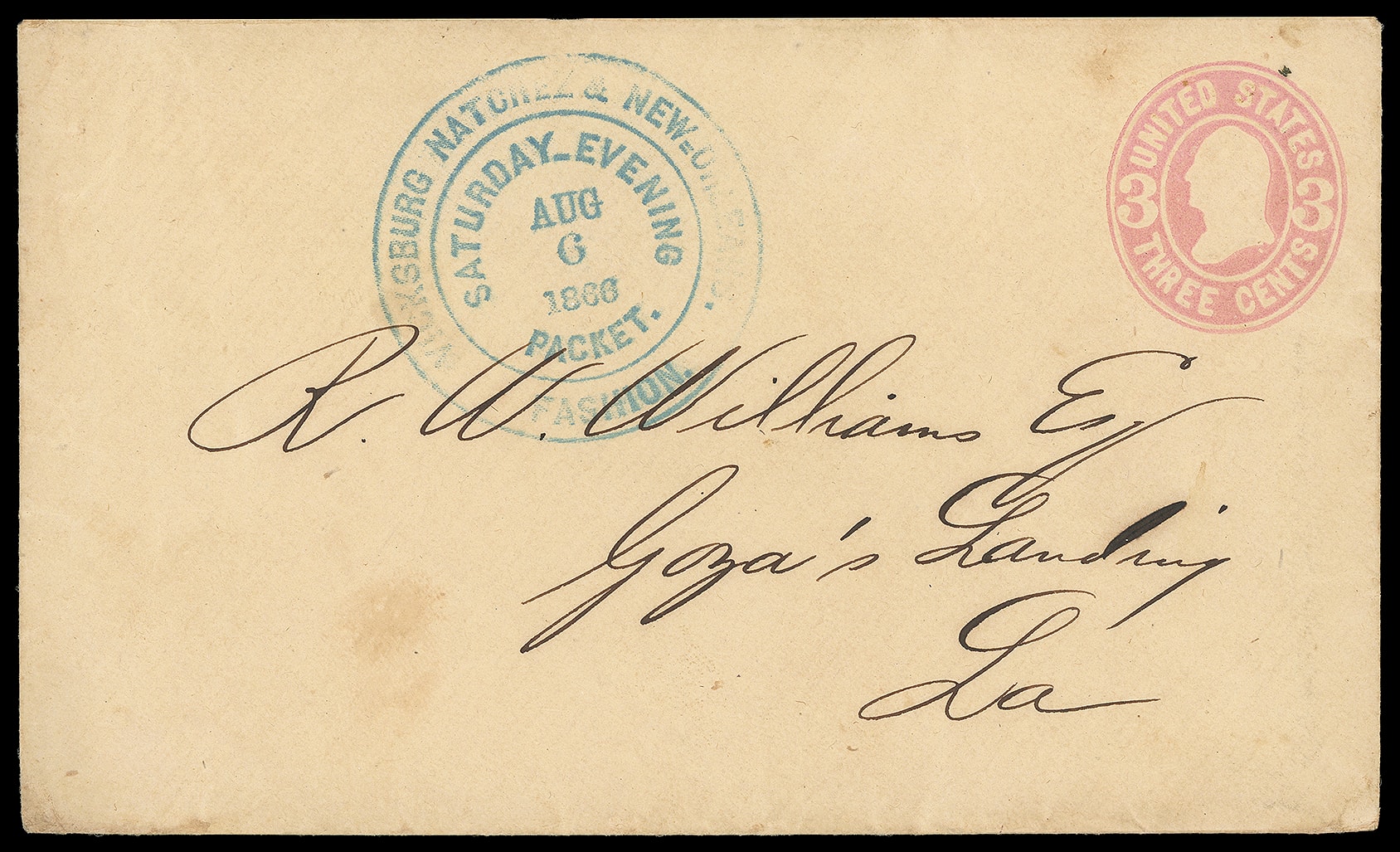 Packet Fashion (Mississippi River). Large blue "Saturday-Evening, Aug 6 1866" double-circle datestamp on 3¢ pink (U59) buff entire to Goya's Landing La.; part of the flap torn away, Very Fine and scarce bold strike. Milgram No.