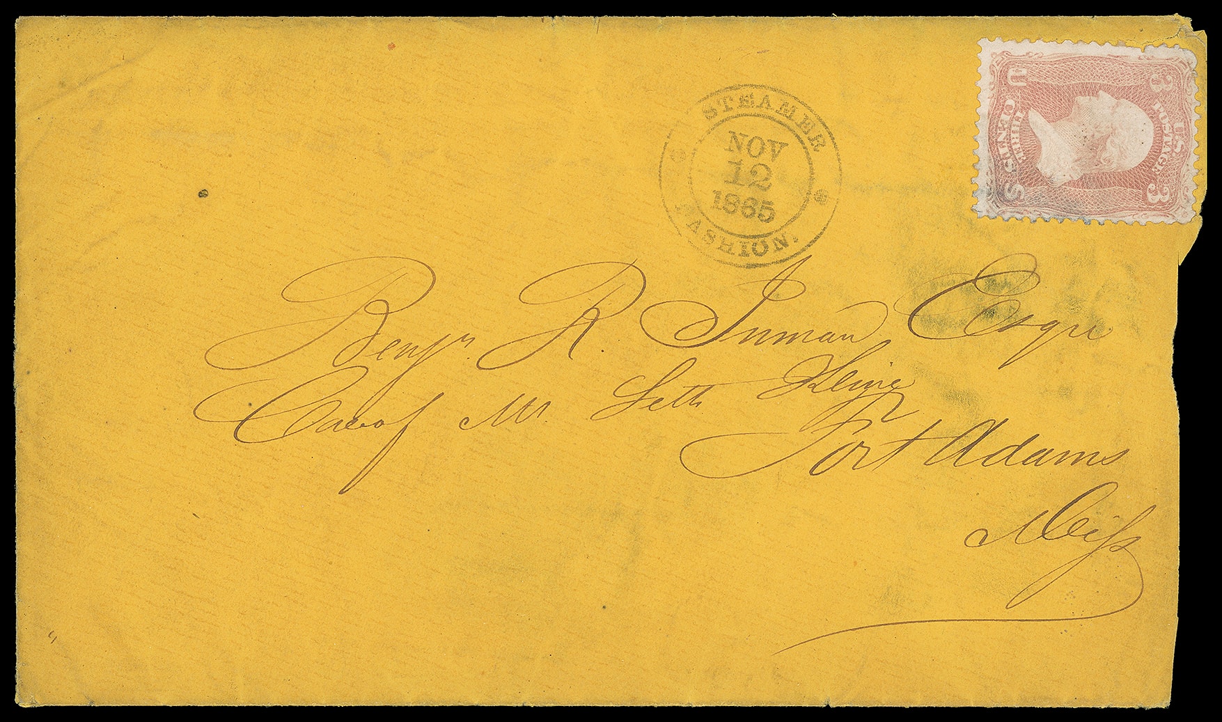 (Mississippi River). Complete "Nov 12 1865" double circle handstamp on cover bearing 3¢ rose (65), small faults, tied by soiling to Fort Adams, Miss.; roughly opened along right edge, Fine and scarce. Milgram No. 456; Estimate $50
