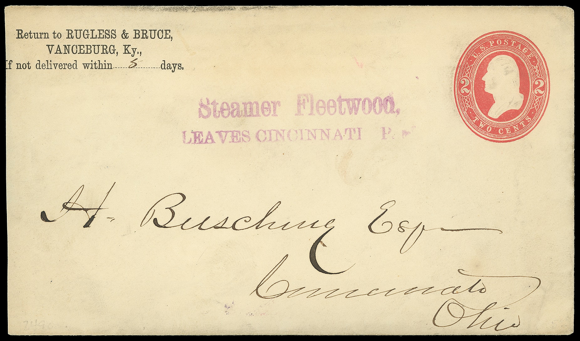 Fleetwood. Magenta two-line straightline on 1884 2¢ red entire to Cincinnati, Ohio; slightly reduced at left with part of left flap torn away, Very Fine, unlisted in Milgram, ex-Milgram. Milgram No. 458B; Estimate $75 -