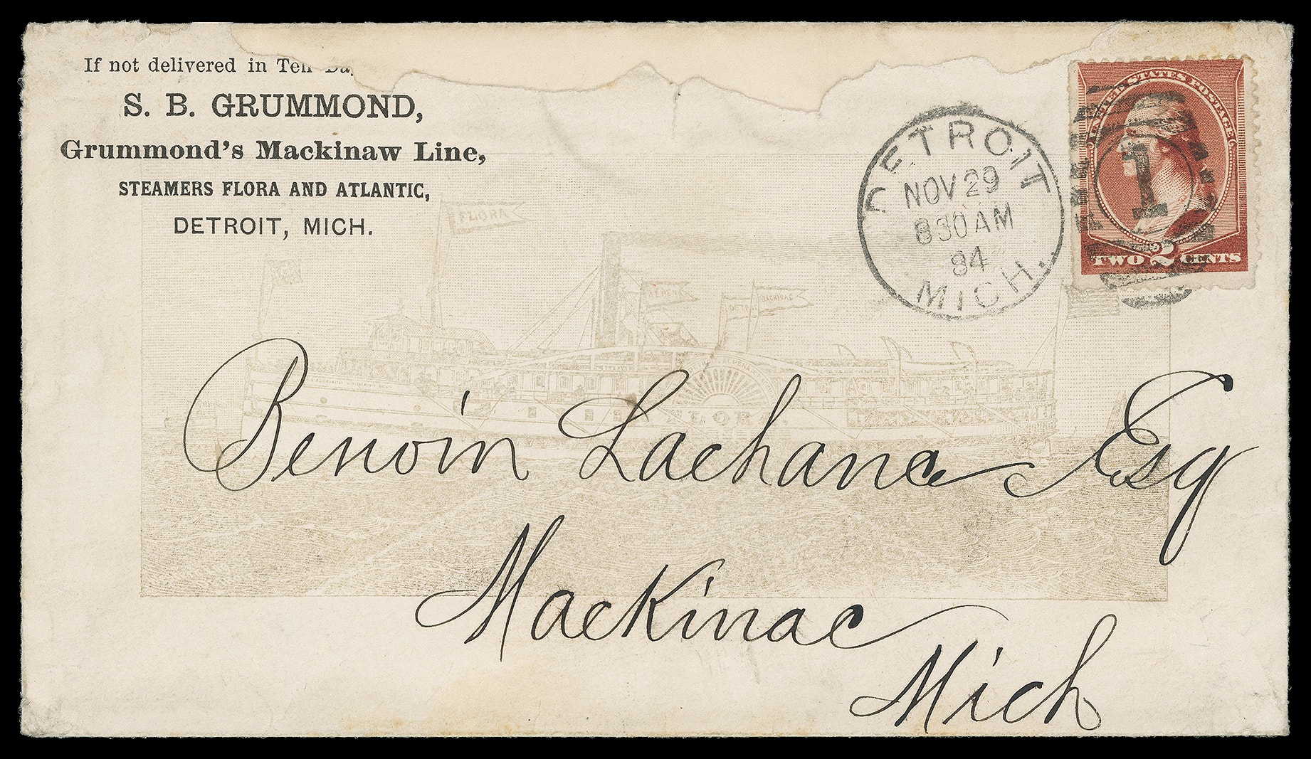 Line, Steamers Flora and Atlantic (Great Lakes). Overall light gray illustration showing Steamer Flora on cover bearing 2¢ red brown (210) tied by "Detroit Mich. Nov 29 '84" duplex to Mackinac, Michigan; cover torn away